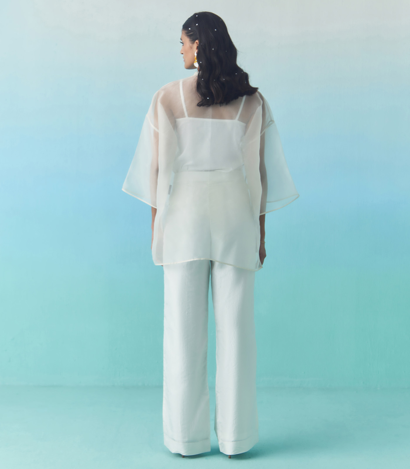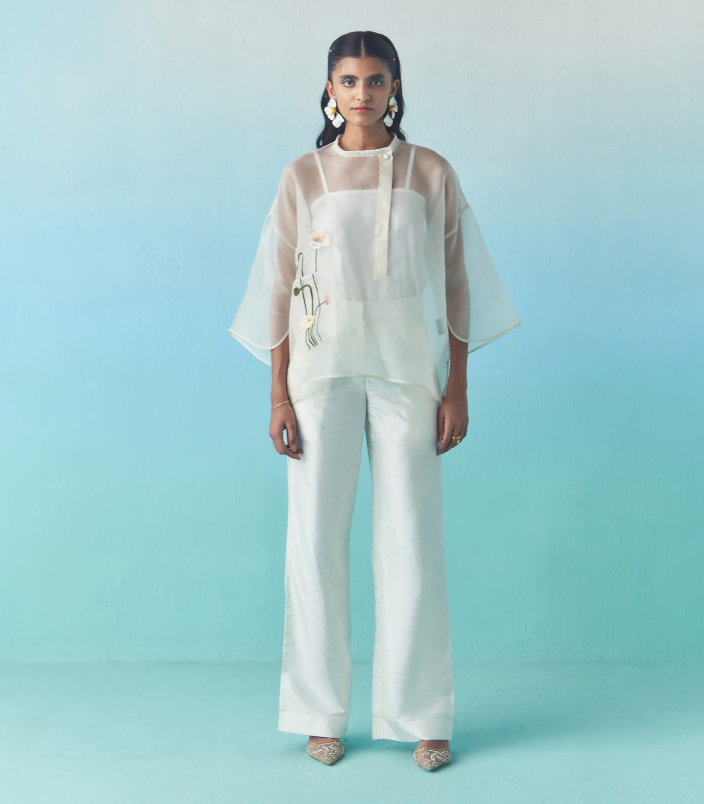 An oversized fit organza top featuring a hand embellished front pocket, crafted in pastel coloured threads. It comes with a 100% cotton bustier inside.