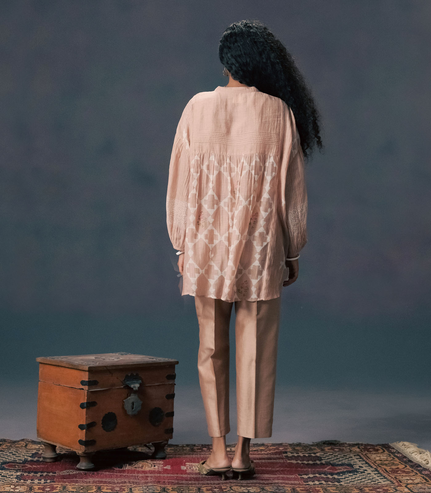 MOCHA MOUSSE DISCHARGE PRINT PIN TUCK SHIRT IN MUL CHANDERI WITH STRAIGHT PANTS IN SILK CHANDERI