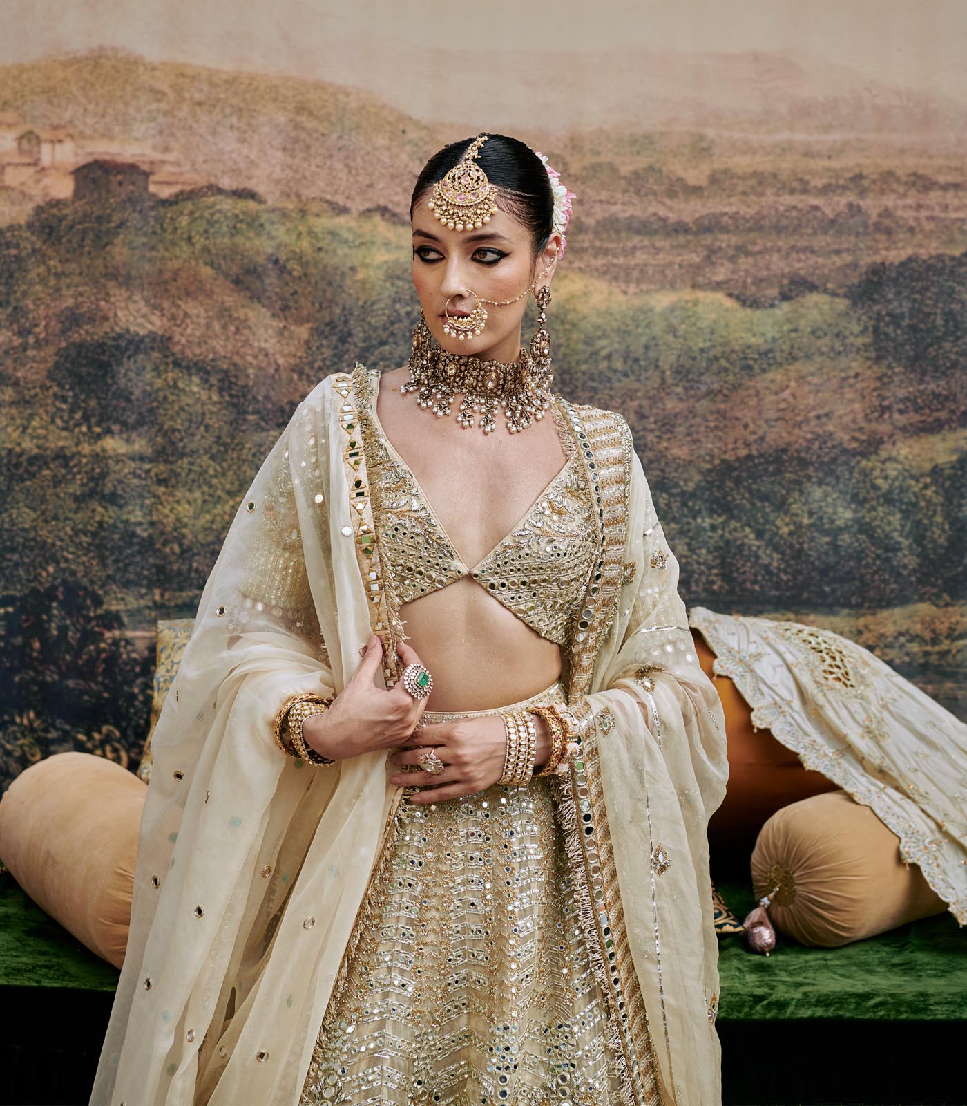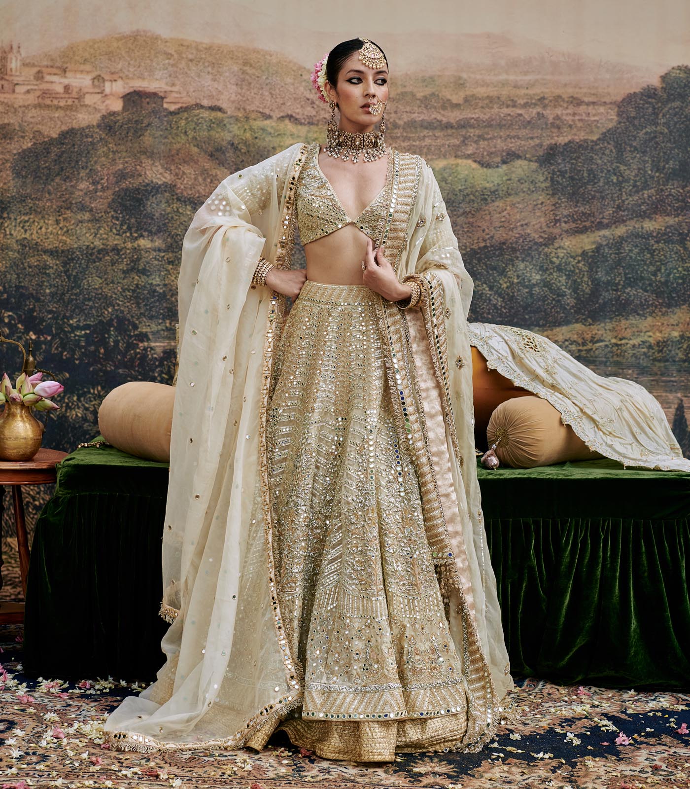 This organza Lehenga comprises of intricate hand embroidery featuring delicate gota work , mirror work. Paired with a organza blouse and dupatta with gota work .