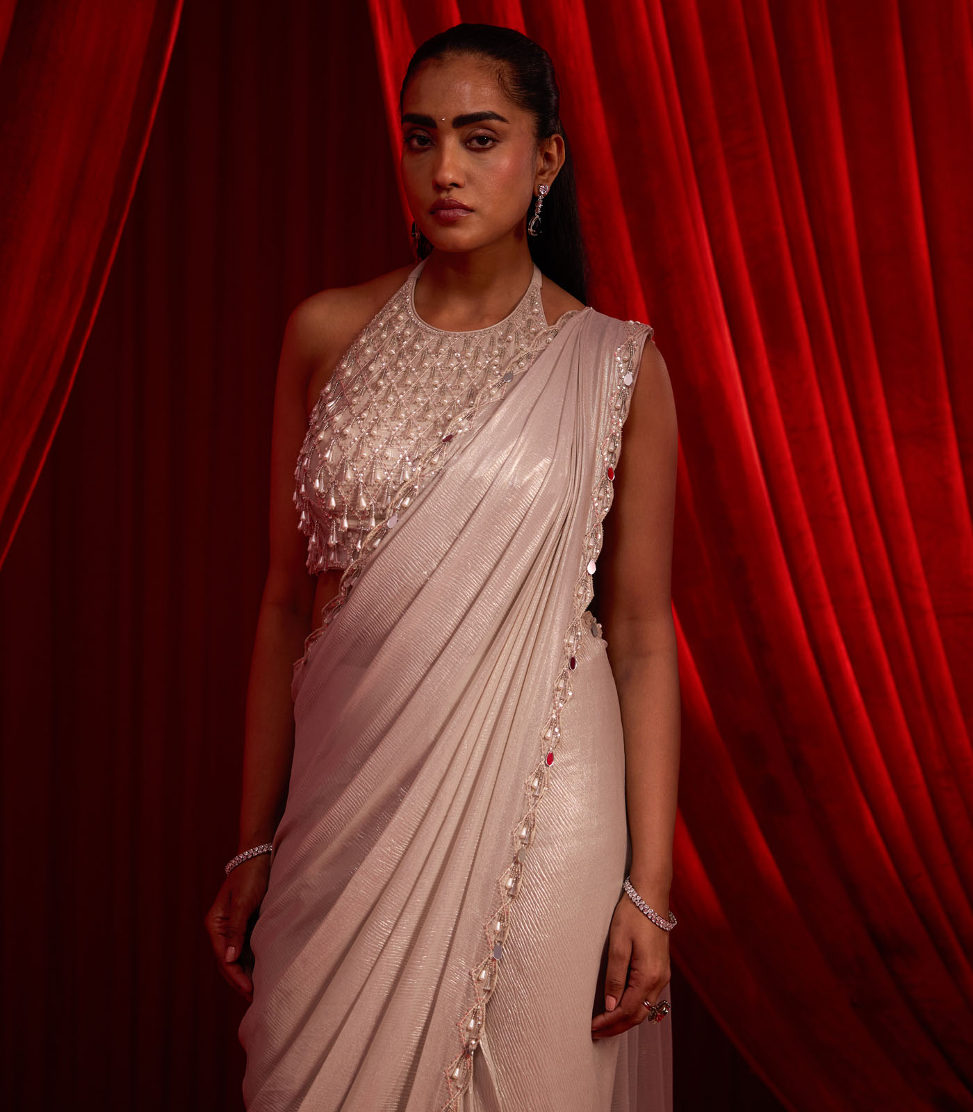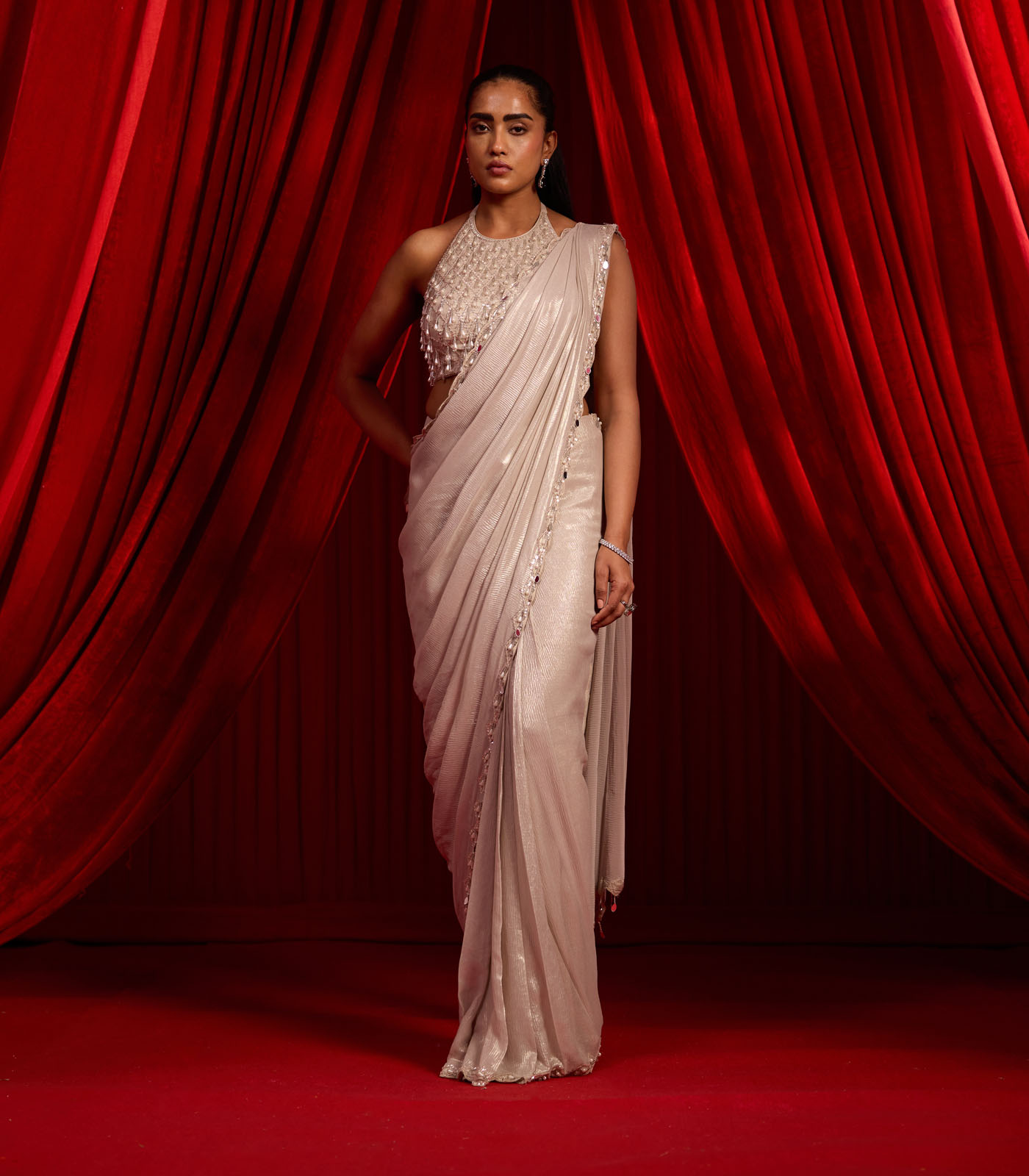 An elegant Nude drape saree crafted in luxe chiffion fabric, designed to contour the silhouette with effortless grace. Paired with a statement halter-style blouse adorned in intricate crystal drop and bead embellishments, this ensemble exudes modern glamour. Perfect for cocktail evenings, receptions, and refined celebrations