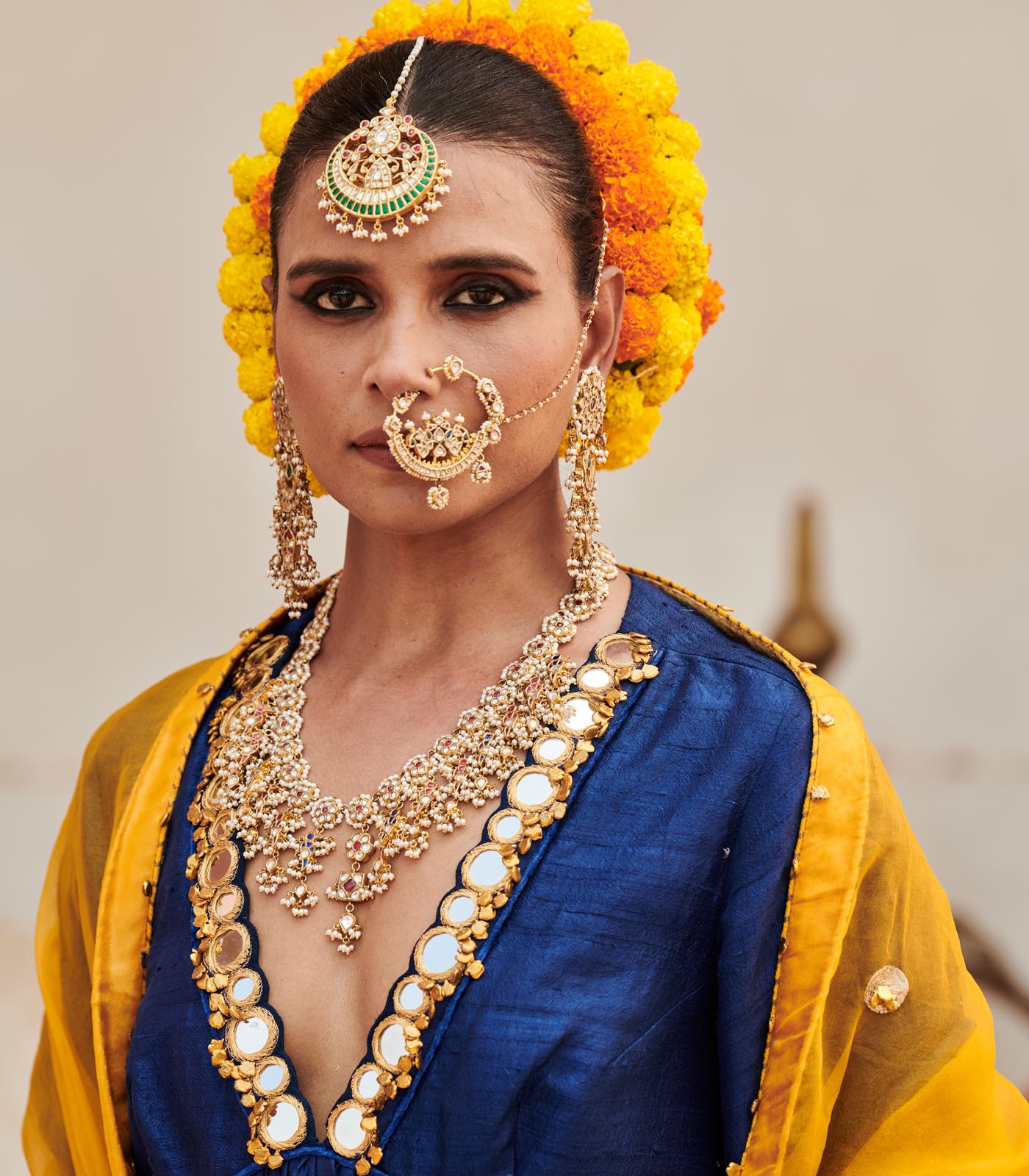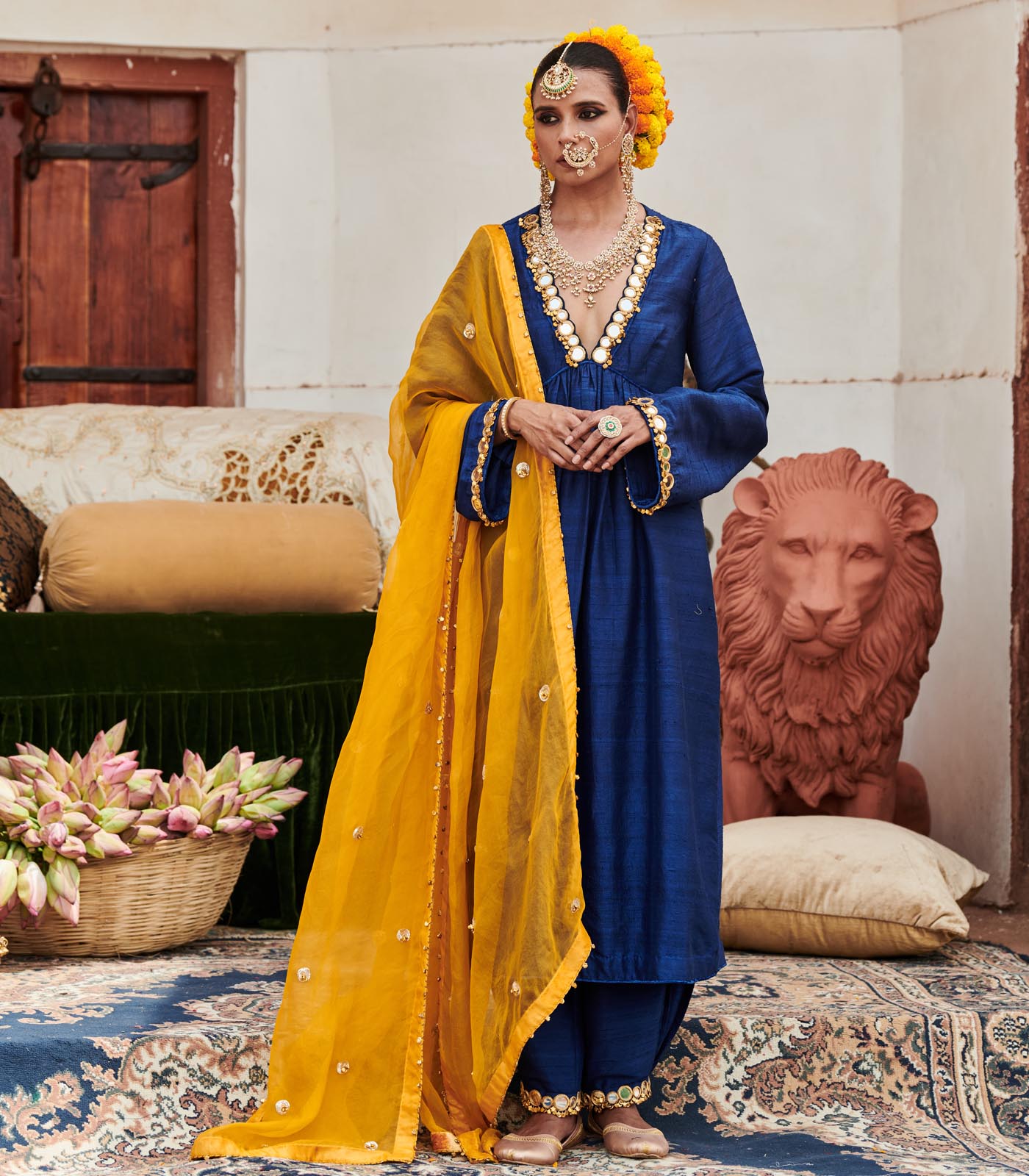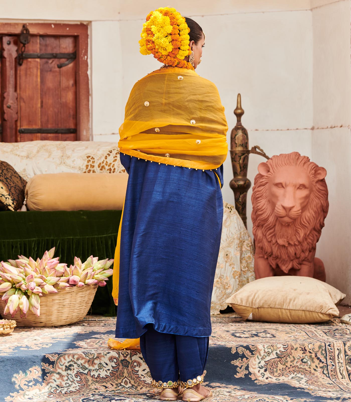 Blue Raw Silk sharara set with mirror work on neckline and sleeves of tunic and matching pants paired with a contrasting yellow organza dupatta.