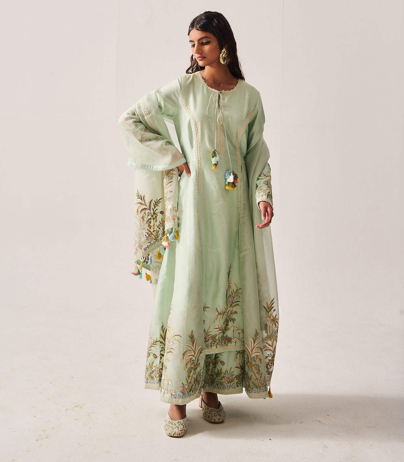 Side Panel Kurta with Flare Pants and Dupatta / Chanderi / Light Sage / Floral Palms / Resham/Hand Embroidery