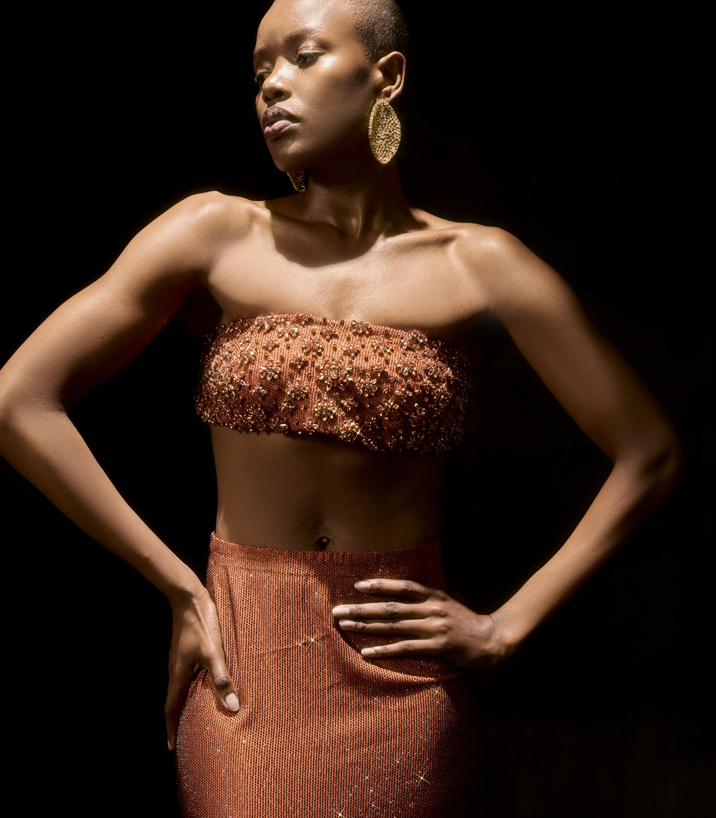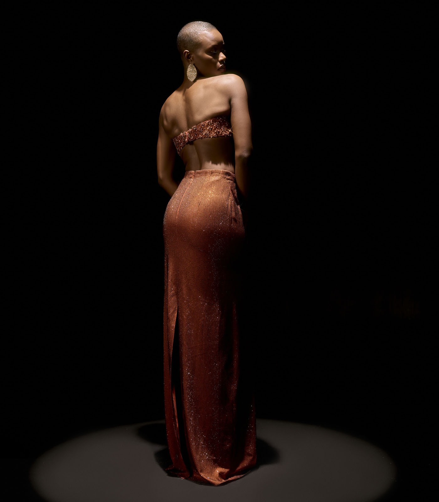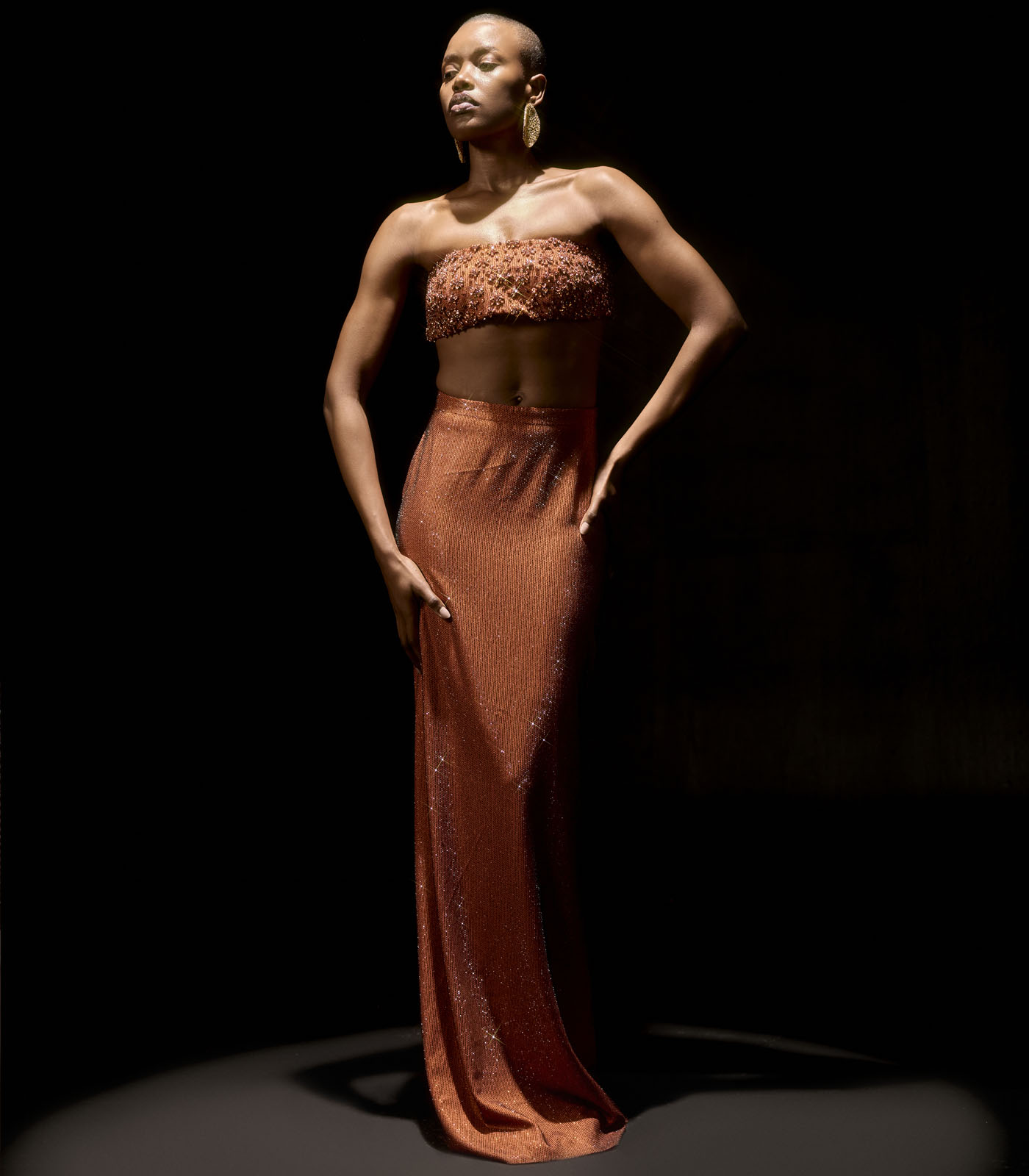A rust self crystaled pencil skirt paired with a dainty motif embroidered bralette