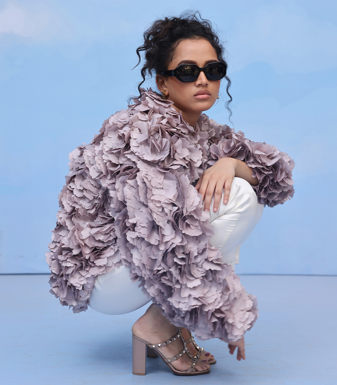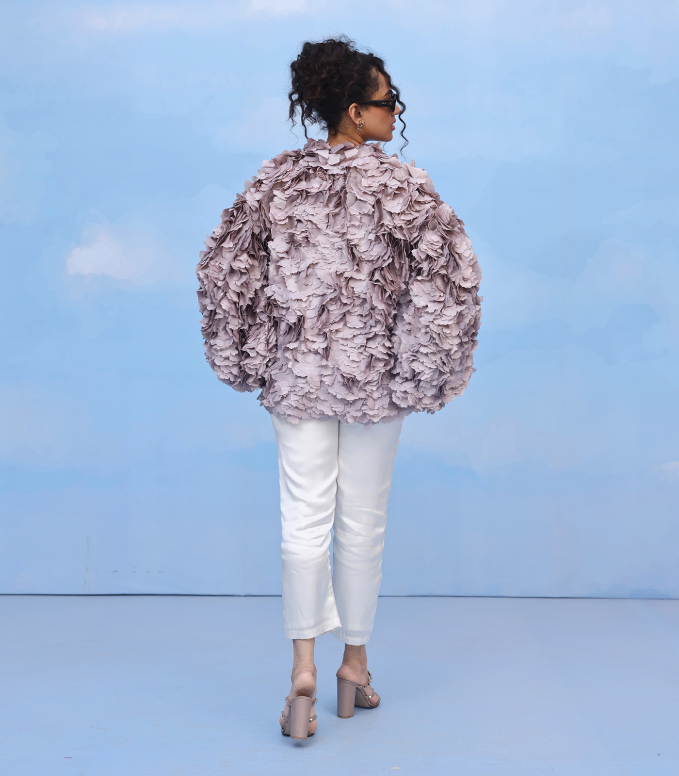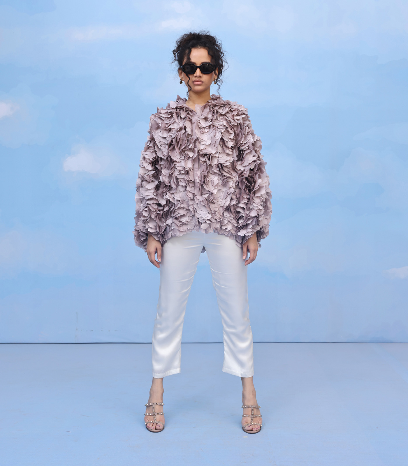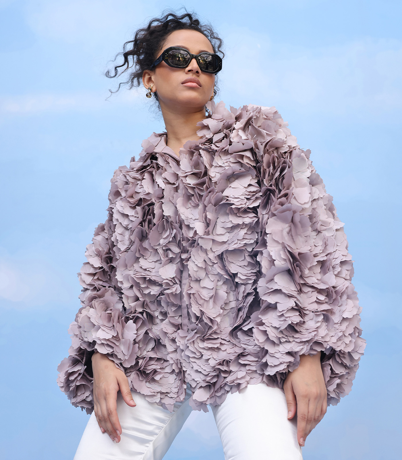 An oversized crepe shirt, featuring paper silk 3D flower patchwork, with melon sleeves and narrow point collar, designed to give a blooming feminine look.