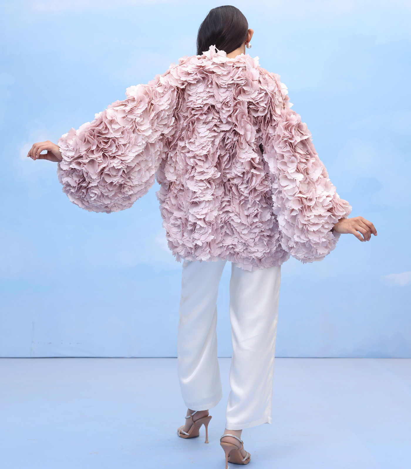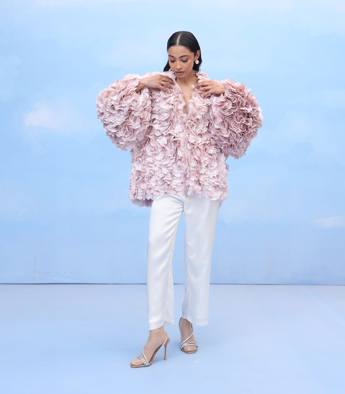 An oversized crepe shirt, featuring paper silk 3D flower patchwork, with melon sleeves and narrow point collar, designed to give a blooming feminine look.