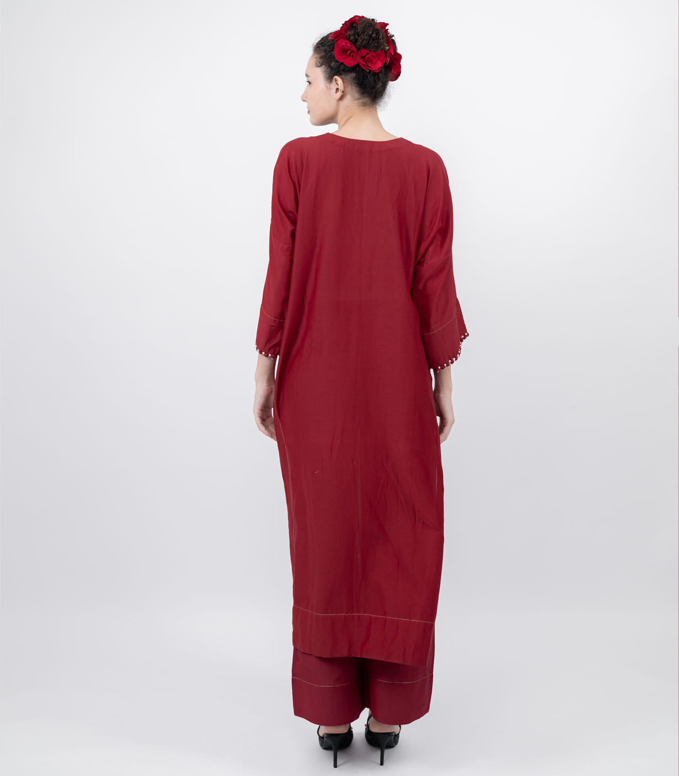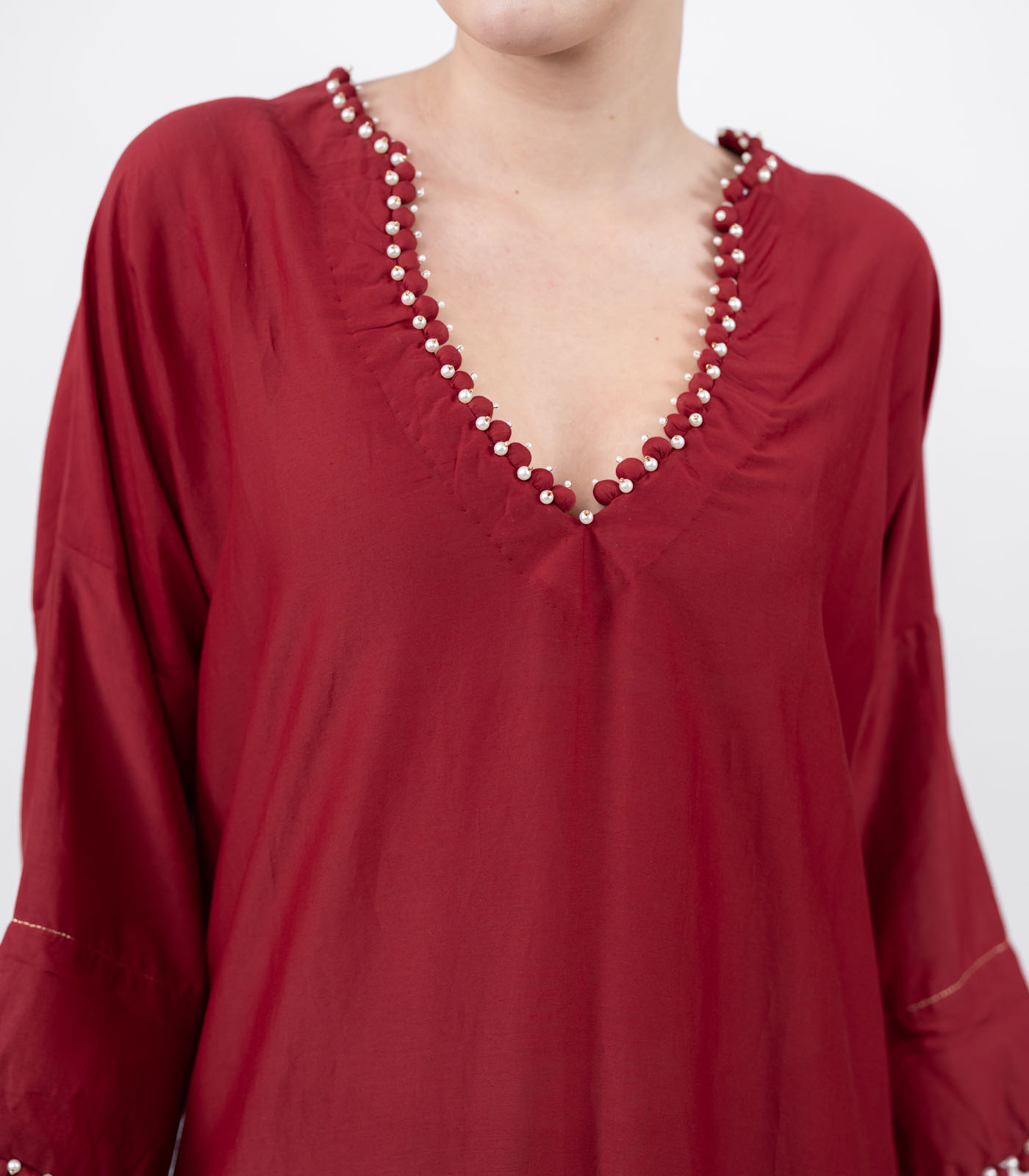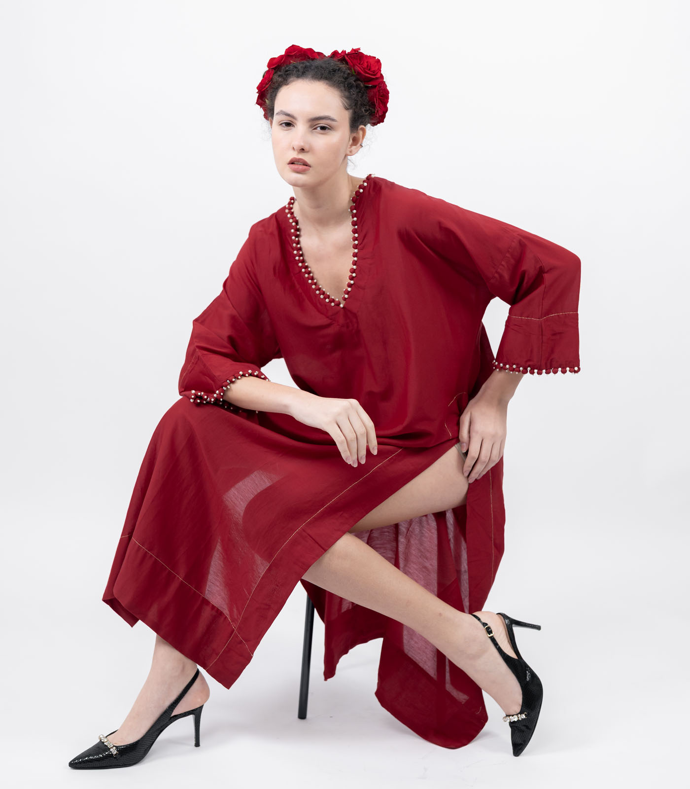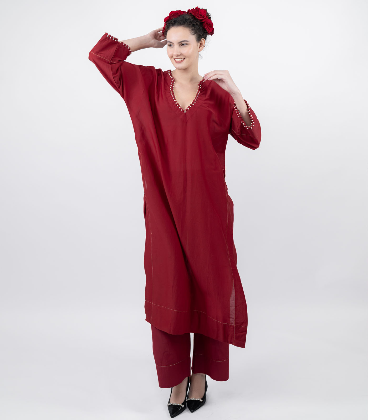 A vision in cotton silk, this kaftan brings together softness and subtle sheen for a look that feels as luxurious as it is effortless. Designed in a relaxed flowing silhouette, it’s plunging neckline, is traced with delicate potli buttons and hand- set pearls to add a touch of quiet drama. The silhouette flows freely, yet surprises with high slits that lend movement, allure, and a bold edge to its timeless grace. Minimal, fluid, and finely detailed, this kaftan balances tradition with modernity— crafted for the woman who find luxury in simplicity.