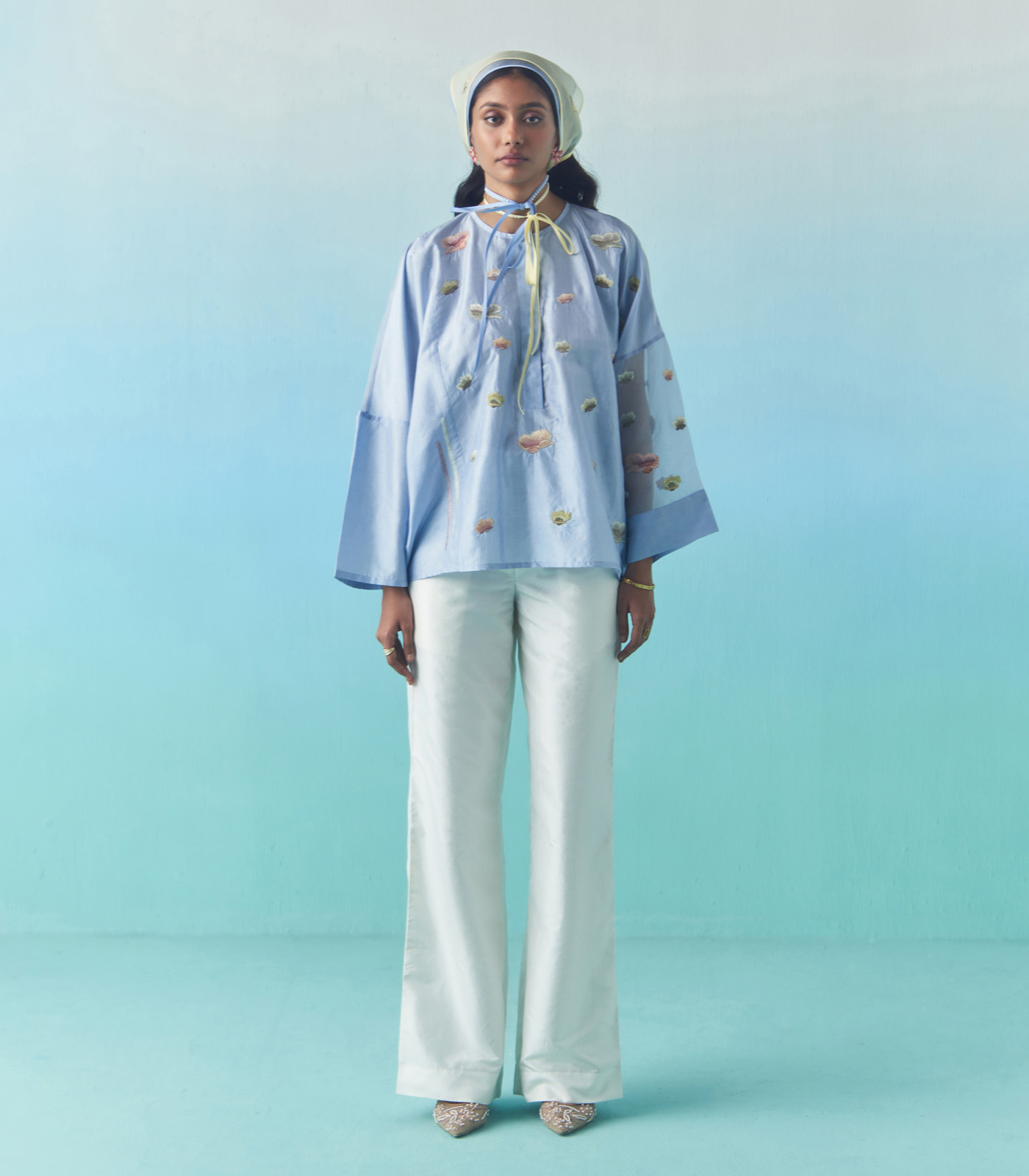 A breezy wardrobe staple, the anti-fit top in sky colour has been intricately embellished with poppy motifs with pastel threads