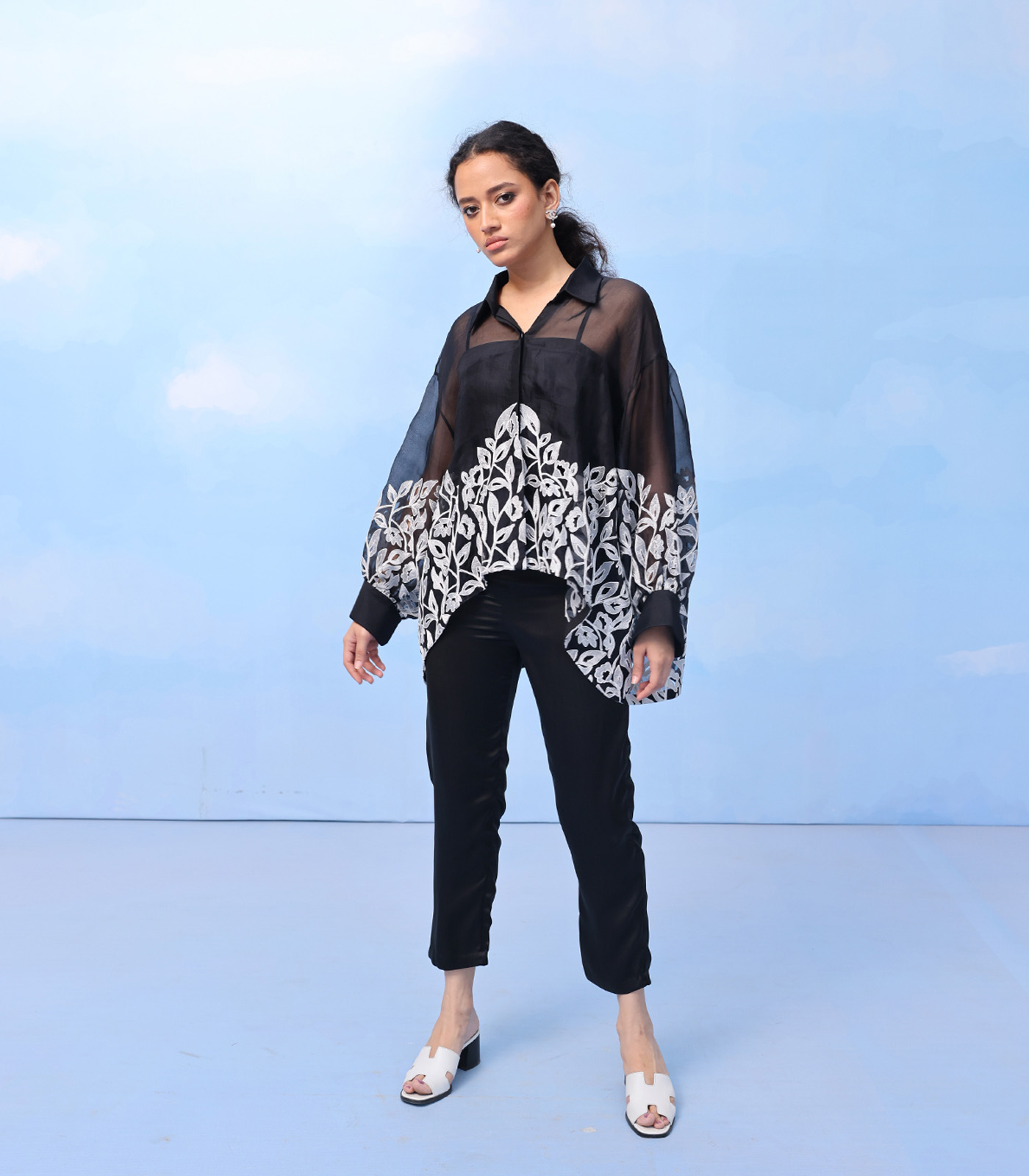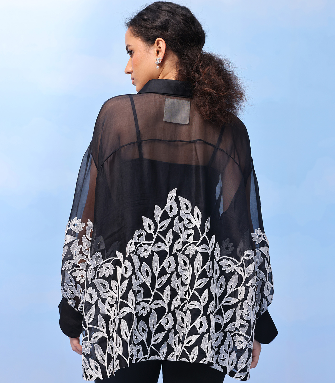 Oversized machine embroidred flared panelled shirt on silk organza. Featuring bishop sleeves, creating an elegant look.