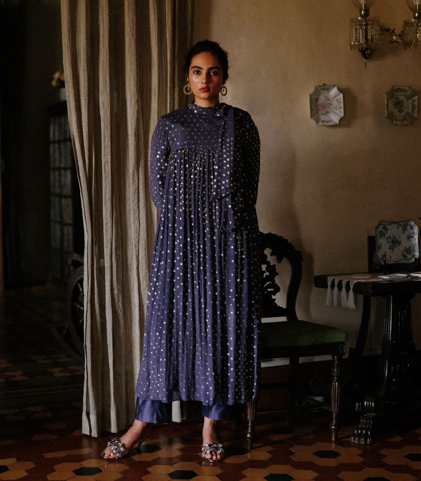 Our Stardust kurta set dazzles with delicate hand-embroidered antique gold sequin flowers work covering the entire kurta. This piece features a stylish tie-up neck, adding a touch of elegance and uniqueness to this beautifully crafted ensemble. Perfect for adding a hint of shimmer to any festive or formal occasion.