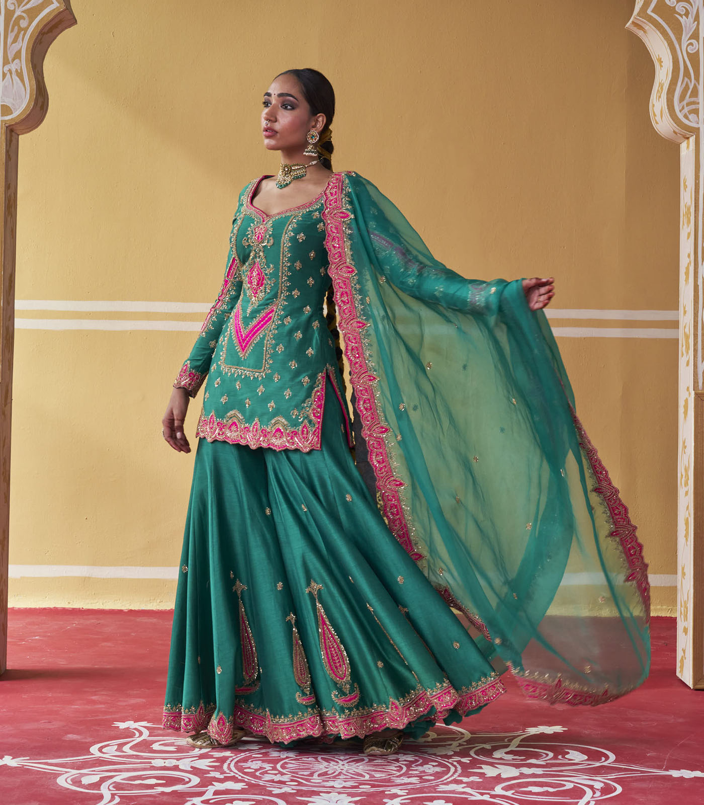 Featuring a Rama green chanderi silk sharara set paired with an organza base dupatta with antique gold dori and embellished hand embroidery.