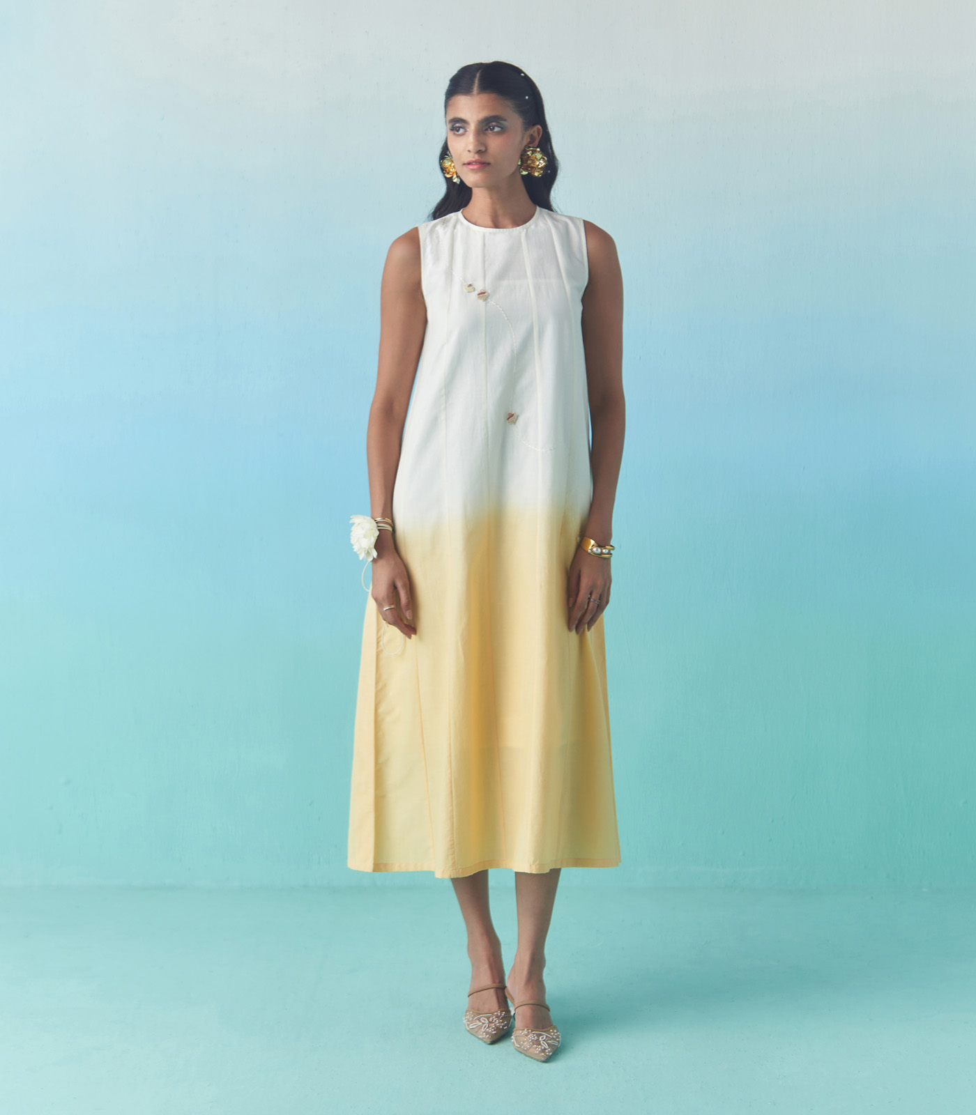 An ombré sleeveless dress in shades of ivory and pastel peach. Enhanced with hand embroidered appliqued poppies.
