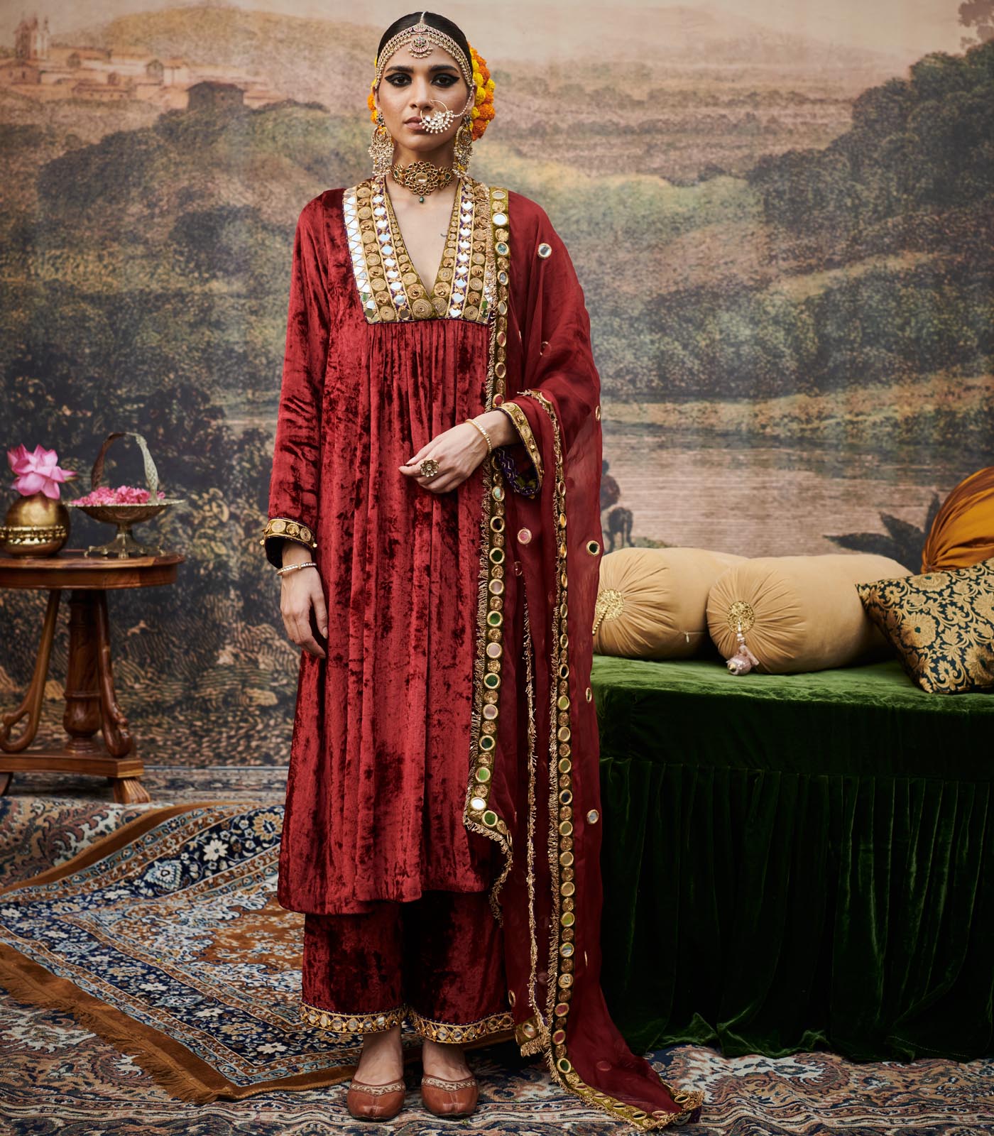Red velvet kurta is adorned with mirror work neckline with a complimenting bottom and organza dupatta with mirror work and hand-embellished ghungroos.