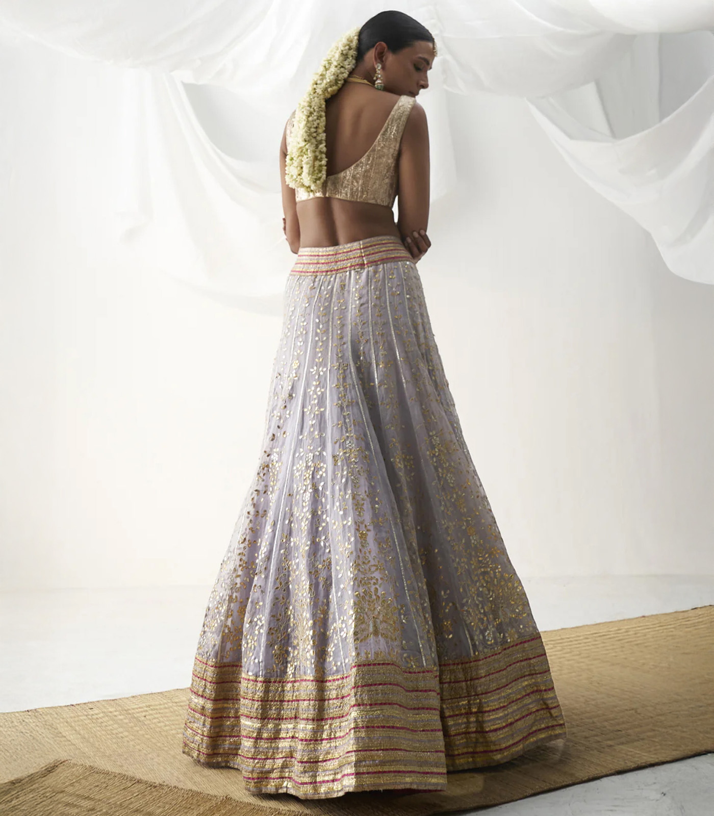 Silver lampi blouse paired with soothing shade of lilac, gota patti embroidered lehenga and dupatta which is edged with kiran.