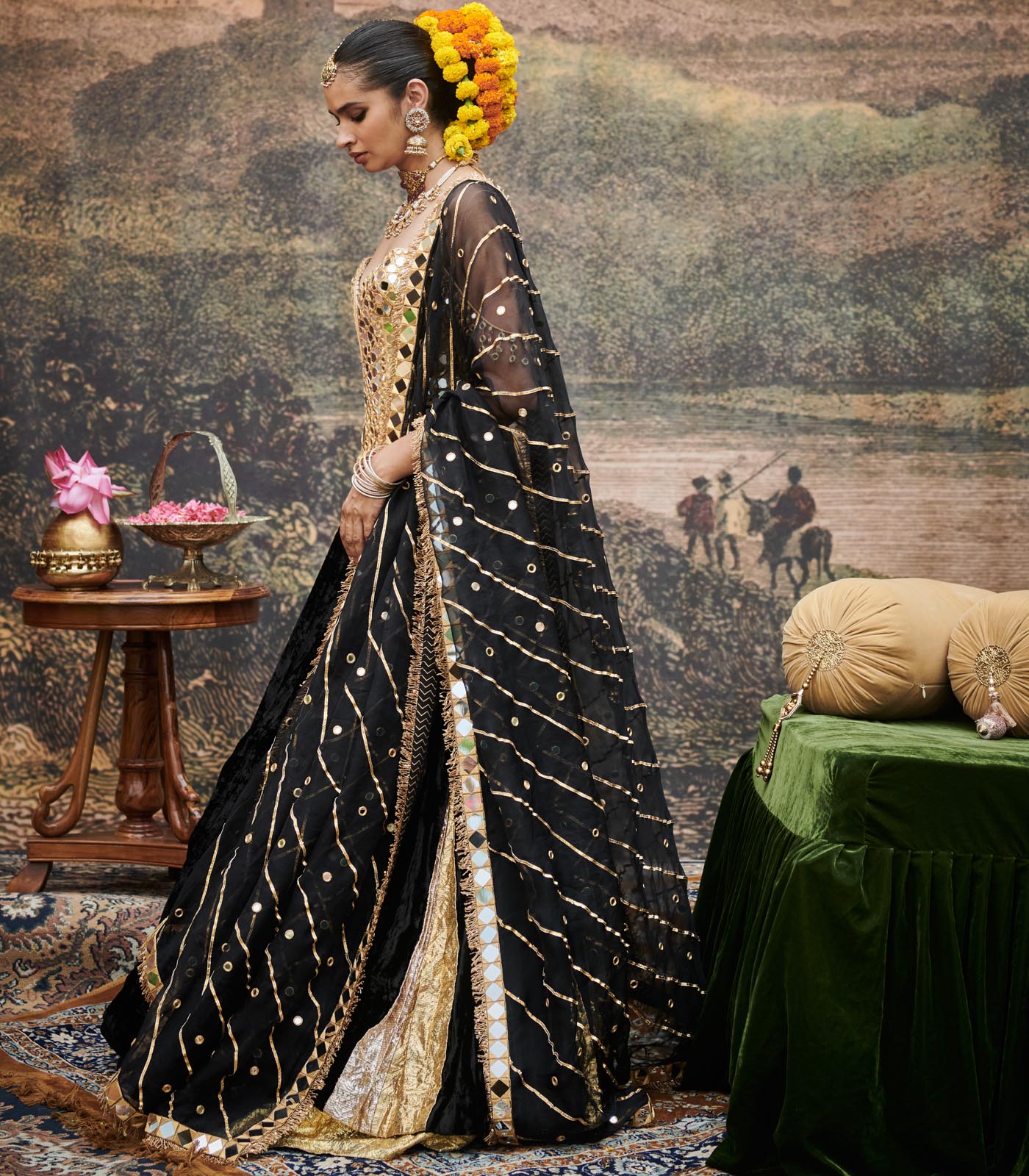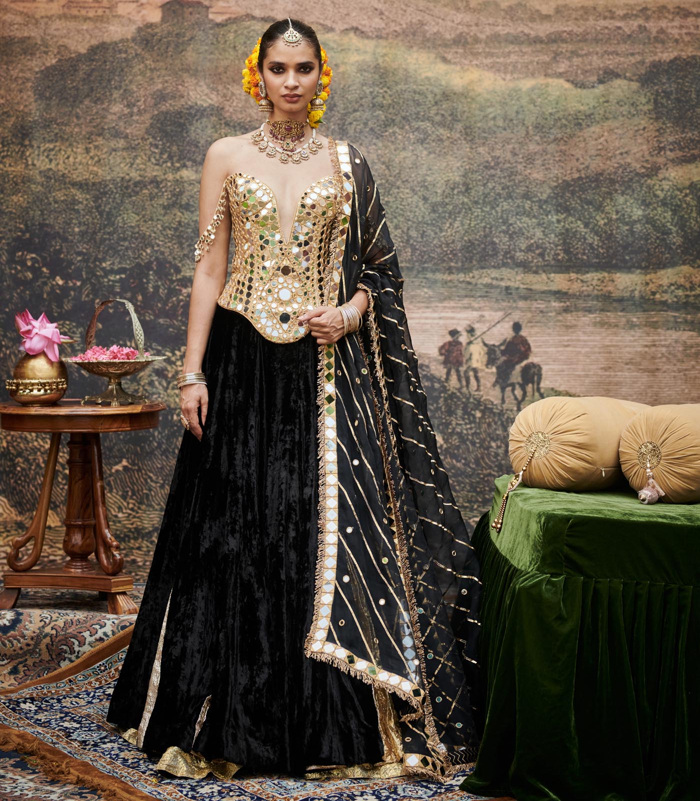 Black velvet godet lehenga with silver-gold lampi godets, styled with a intricate mirror work corset blouse on gota lined with chanderi silk and organza mirrorwork dupatta.