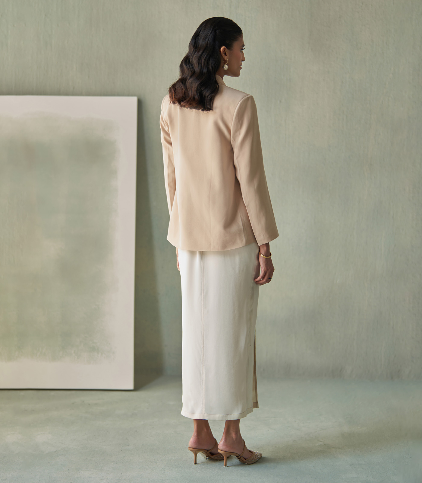 Crafted in fluid silk crepe, this ivory skirt features clean lines and a front slit that adds a touch of modern sophistication. Its tailored fit and minimalist construction make it a versatile piece that moves seamlessly from refined daywear to elegant evening dressing.