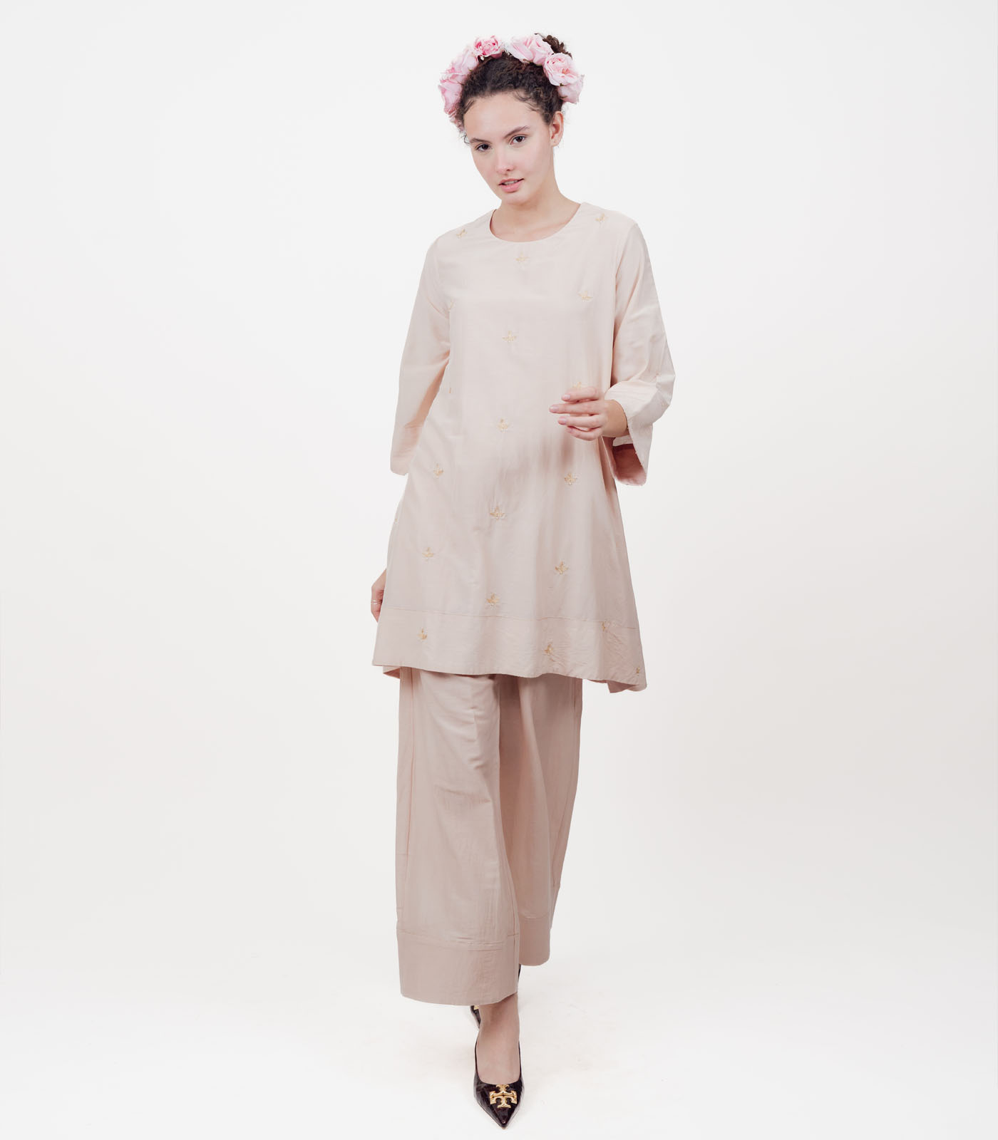 It’s flared, it’s modern it’s festive! Crafted in lustrous cotton silk, this Co- Ord set is a seamless blend of tradition and modern refinement. Fitted bodice flaring gently at the waist, this contemporary long peplum top is delicately hand- embroidered with zari and pearl motifs, adding a touch of understated opulence. Its structured yet fluid silhouette flows gracefully into farshi pants, creating a look that is both regal and contemporary. Perfect for festive soirées or intimate celebrations, this ensemble embodies effortless elegance embedded in a timeless design. Light on the body yet rich in detail, it is a statement of subtle luxury and refined grace.