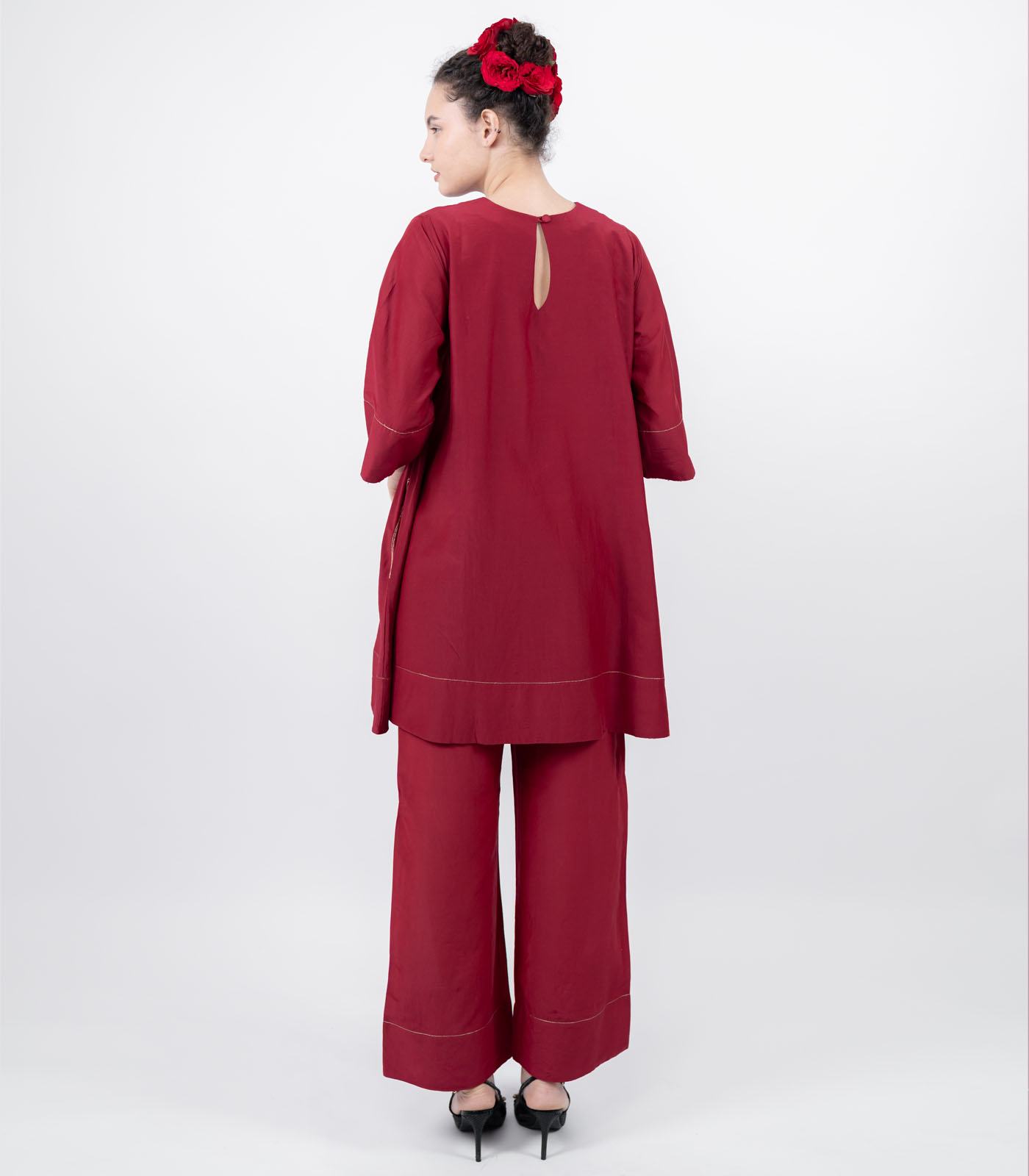 It’s flared, it’s modern it’s festive! Crafted in lustrous cotton silk, this Co- Ord set is a seamless blend of tradition and modern refinement. Fitted bodice flaring gently at the waist, this contemporary long peplum top is delicately hand- embroidered with zari and pearl motifs, adding a touch of understated opulence. Its structured yet fluid silhouette flows gracefully into farshi pants, creating a look that is both regal and contemporary. Perfect for festive soirées or intimate celebrations, this ensemble embodies effortless elegance embedded in a timeless design. Light on the body yet rich in detail, it is a statement of subtle luxury and refined grace.