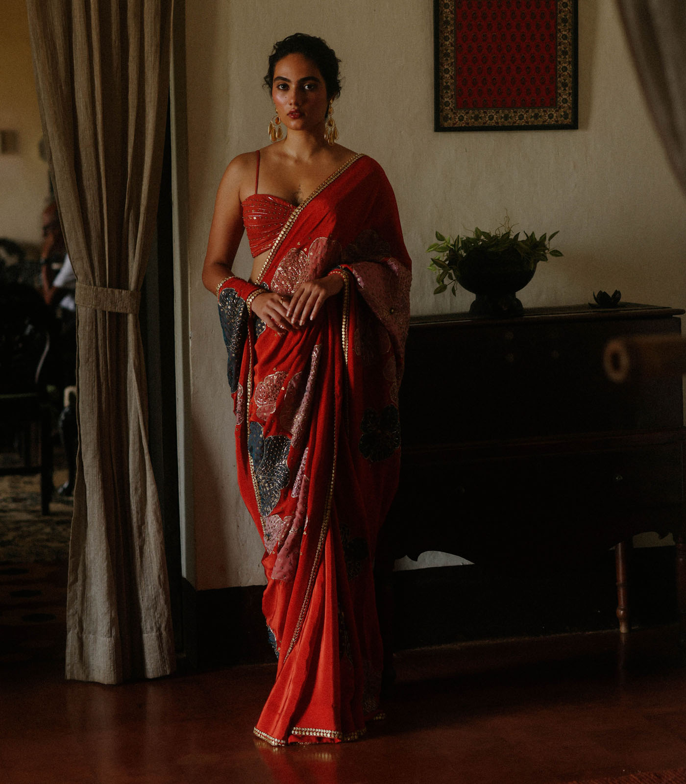 This saree boasts a rich and warm hue, thoughtfully designed with fabric scraps to minimize waste. Each floral motif is meticulously hand-embroidered onto the saree using antique gold work, creating a piece that is as sustainable as it is elegant.