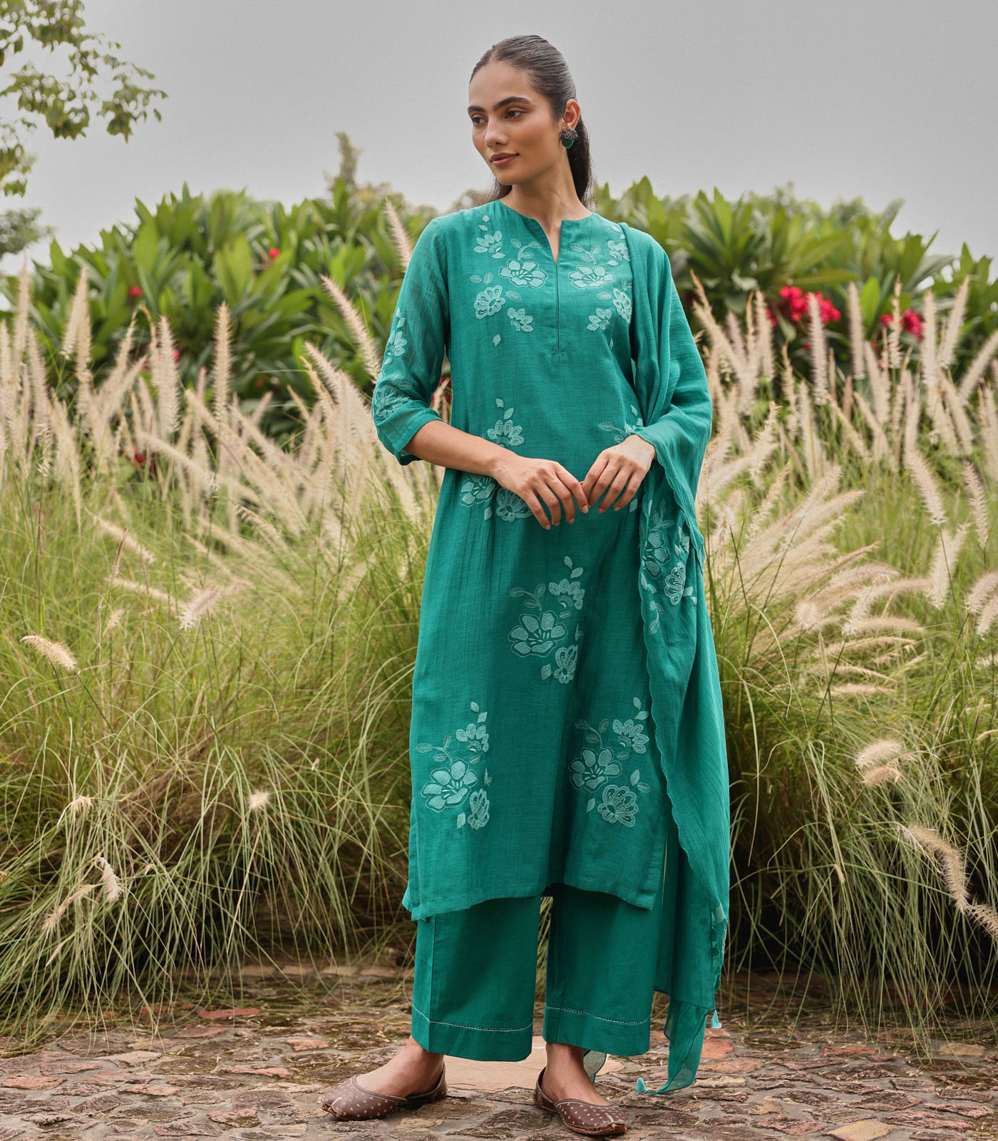 The Teal Appliqué Embroidered Kurta Set showcases a refined blend of delicate appliqué blooms and intricate threadwork embellishing the kurta and sleeves. Designed with a flowy silhouette, it is paired with coordinated pants to create a harmonious and elegant look. The ensemble is completed with a complementing dupatta, adorned with scattered appliqué motifs and finished with signature tassels—making it a graceful choice for festive occasions and celebratory gatherings.