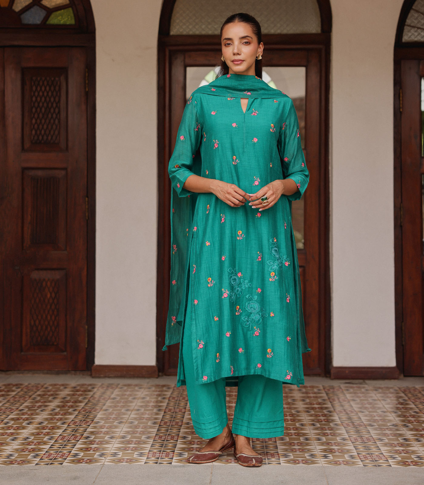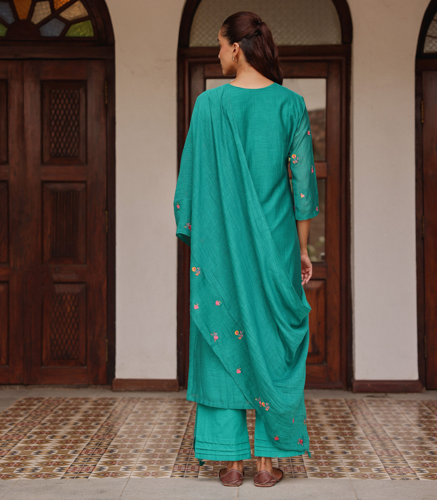 The Teal Bloom Kurta Set is adorned with embroidered blooms artfully scattered across the kurta, complemented by appliqué blooms and intricate thread detailing along the hem. The ensemble is completed with coordinating pants and a dupatta, accentuated with floral motifs and signature tassels, offering a sophisticated and cohesive look.