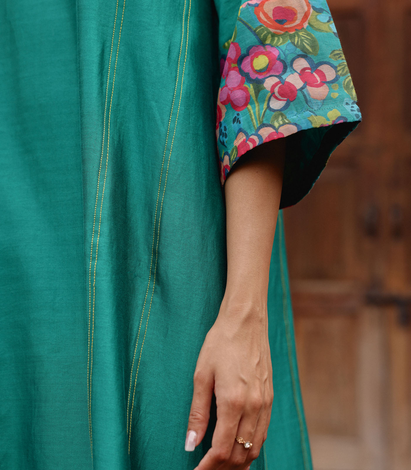 The Teal Co-ord Set is crafted in refreshing tones is tailored in a breezy silhouette with an uneven hemline and tassel details. Voluminous sleeves finished with printed cuffs add a touch of elegance. Complete the look with matching pants patterned in delicate florals.