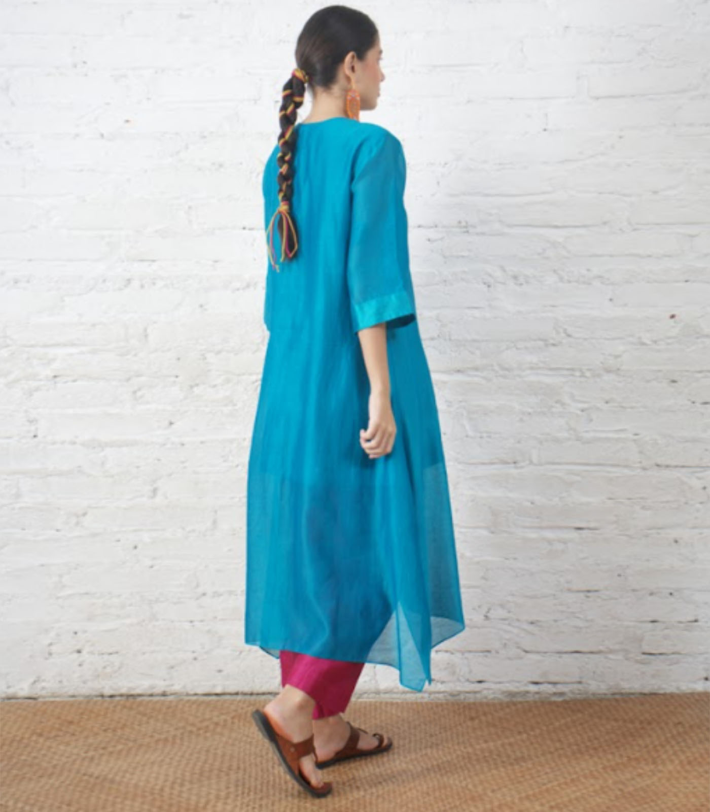 A teal silk chanderi kurta detailed with bright thread and bead embroidery around the neckline. Fuschia pants add an unexpected contrast — simple lines, crafted finish, effortless summer elegance.