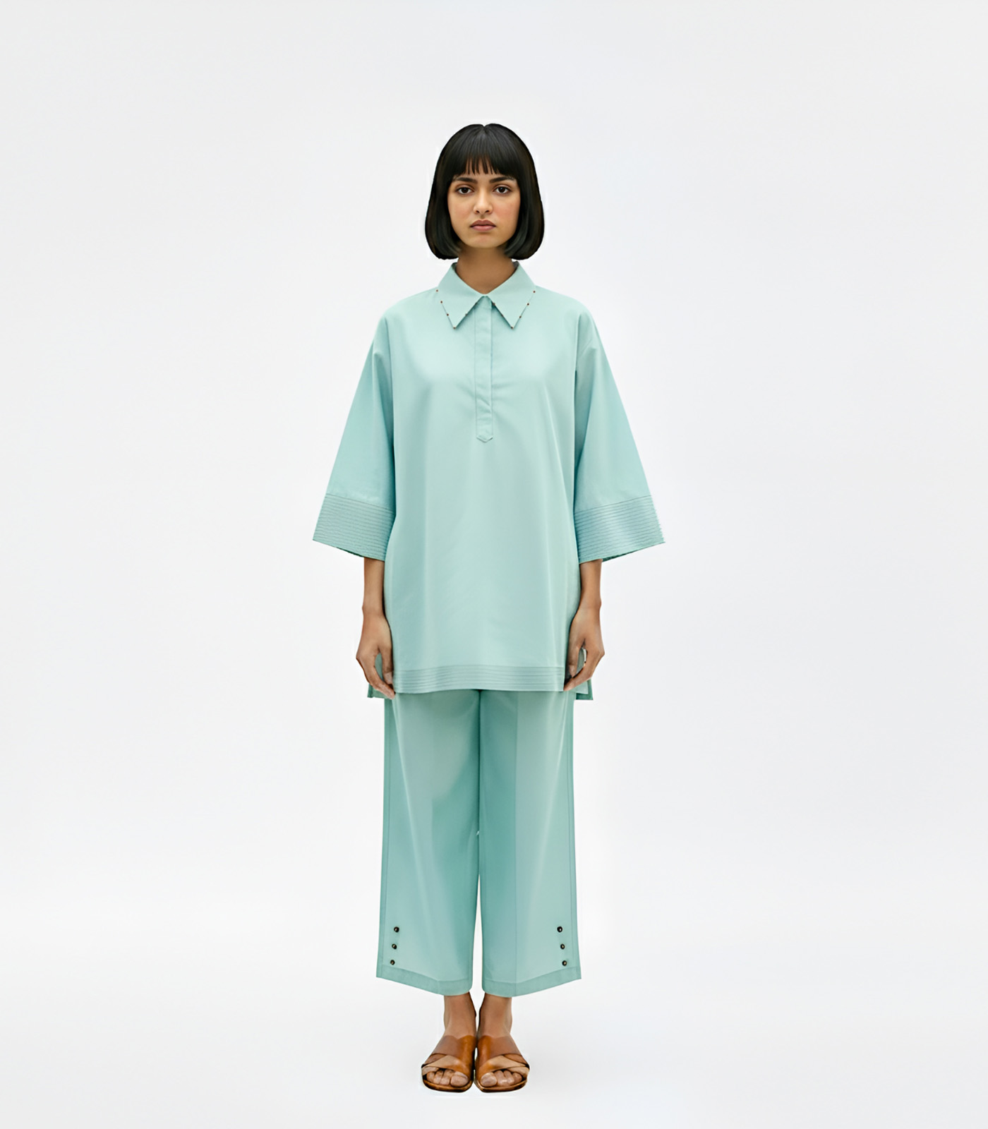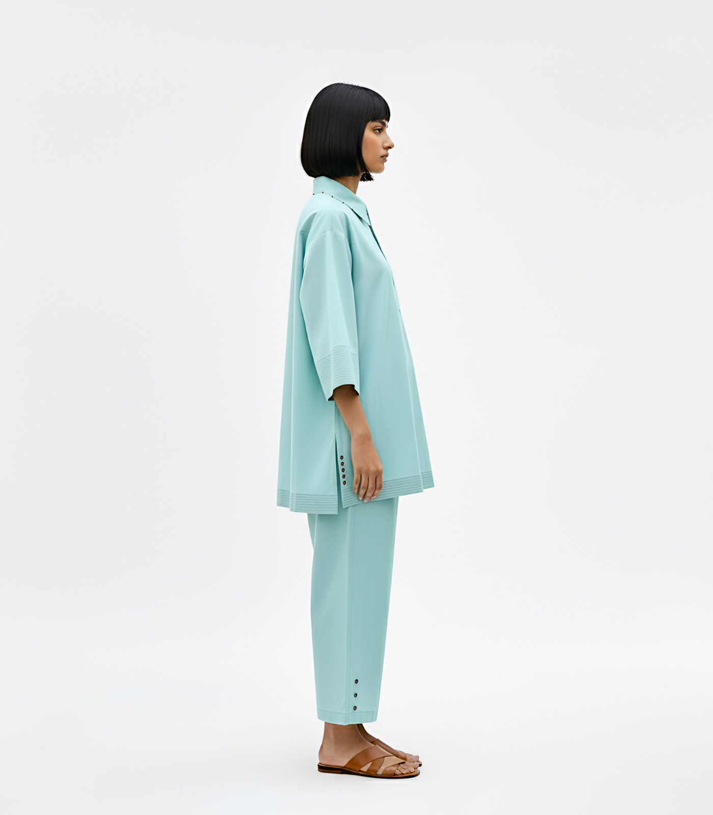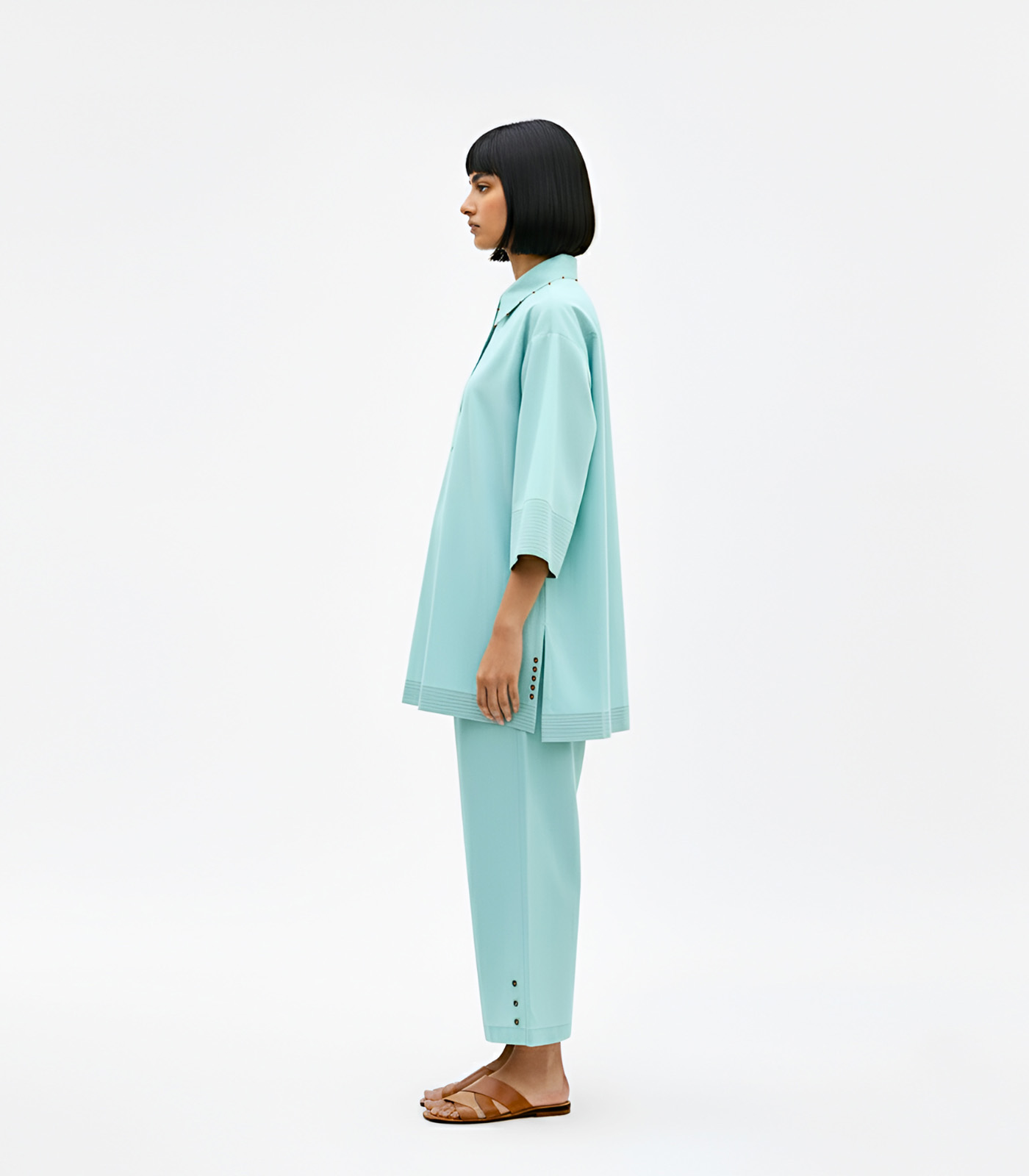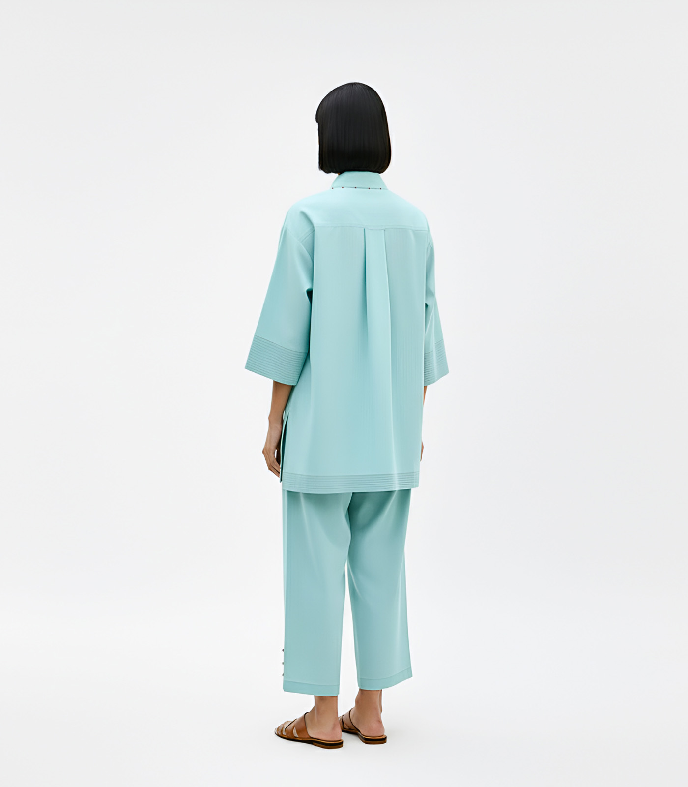 This elegant co-ord set in tiffany blue features stitch lines on the sleeve and hem of the top with a wooden button detail on the side seam of the top, showcasing craftsmanship. Paired with matching pants with wooden button detail on the hem , the set exudes a harmonious blend of style and comfort. Ideal for both casual outings and special occasions, this ensemble promises effortless sophistication with its versatile design. Perfect for making a seamless transition from day to night.
