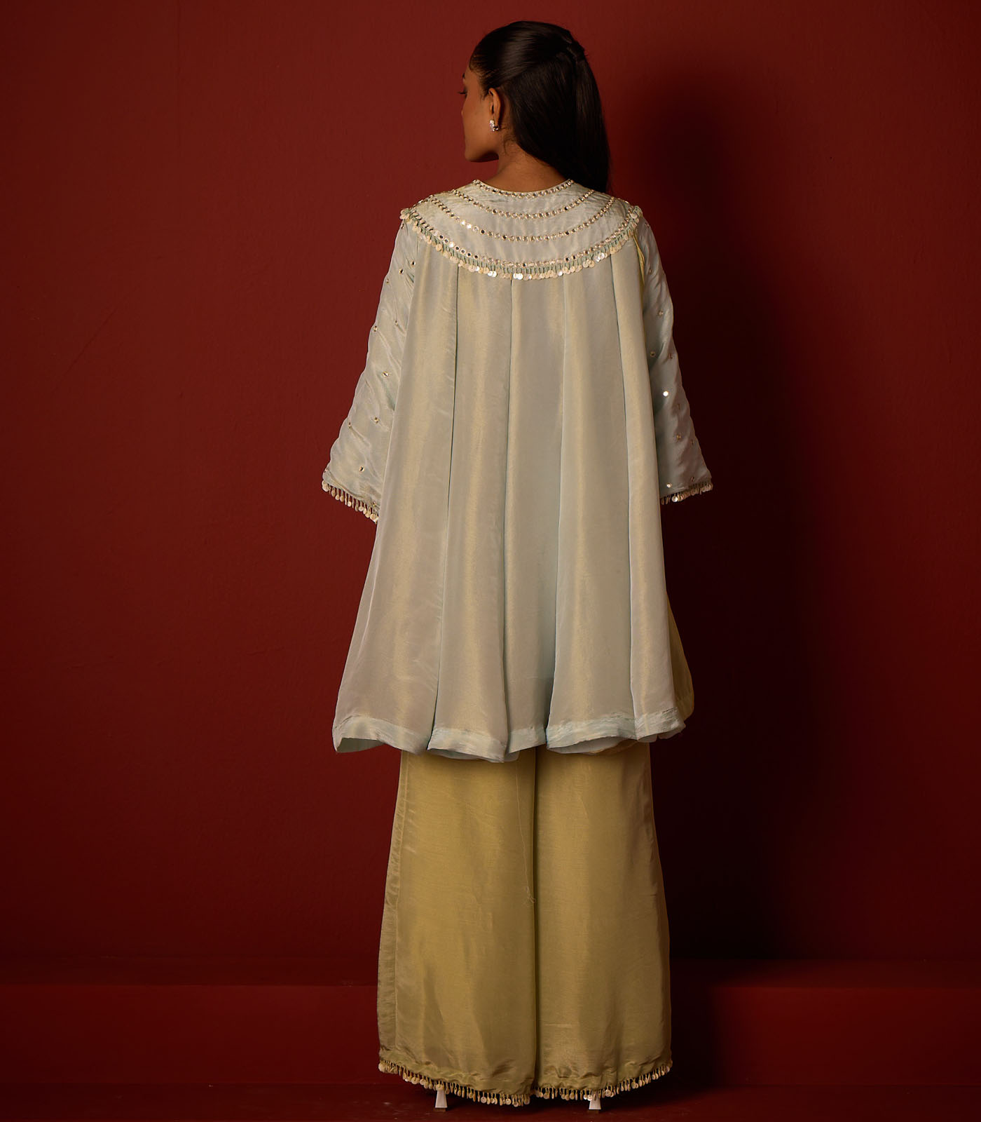Dual Color Tissue Box Pleat Panelled Tunic With 3/4th Sleeves Embellished With Hand Embroidered Mirror Work In Zari, Enhanced with Tassel Details