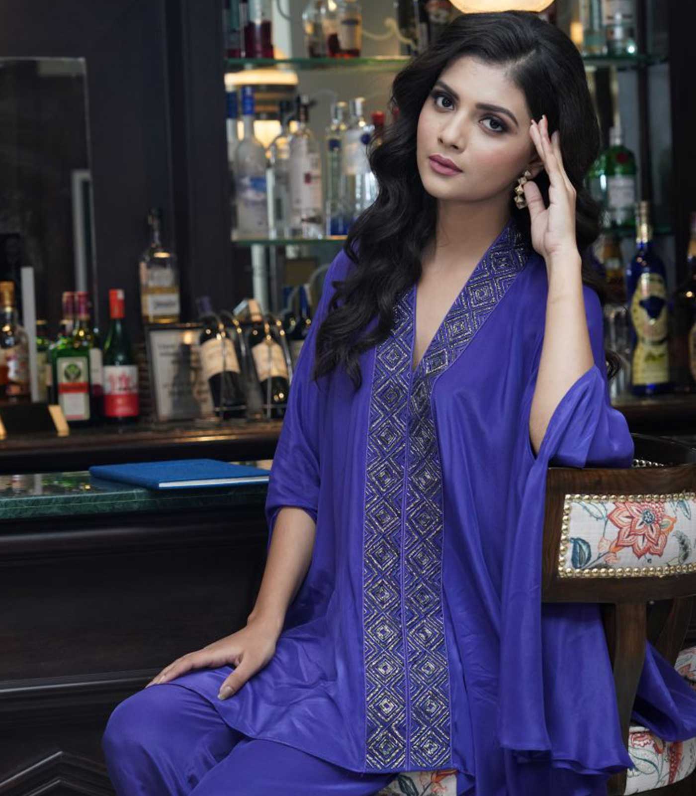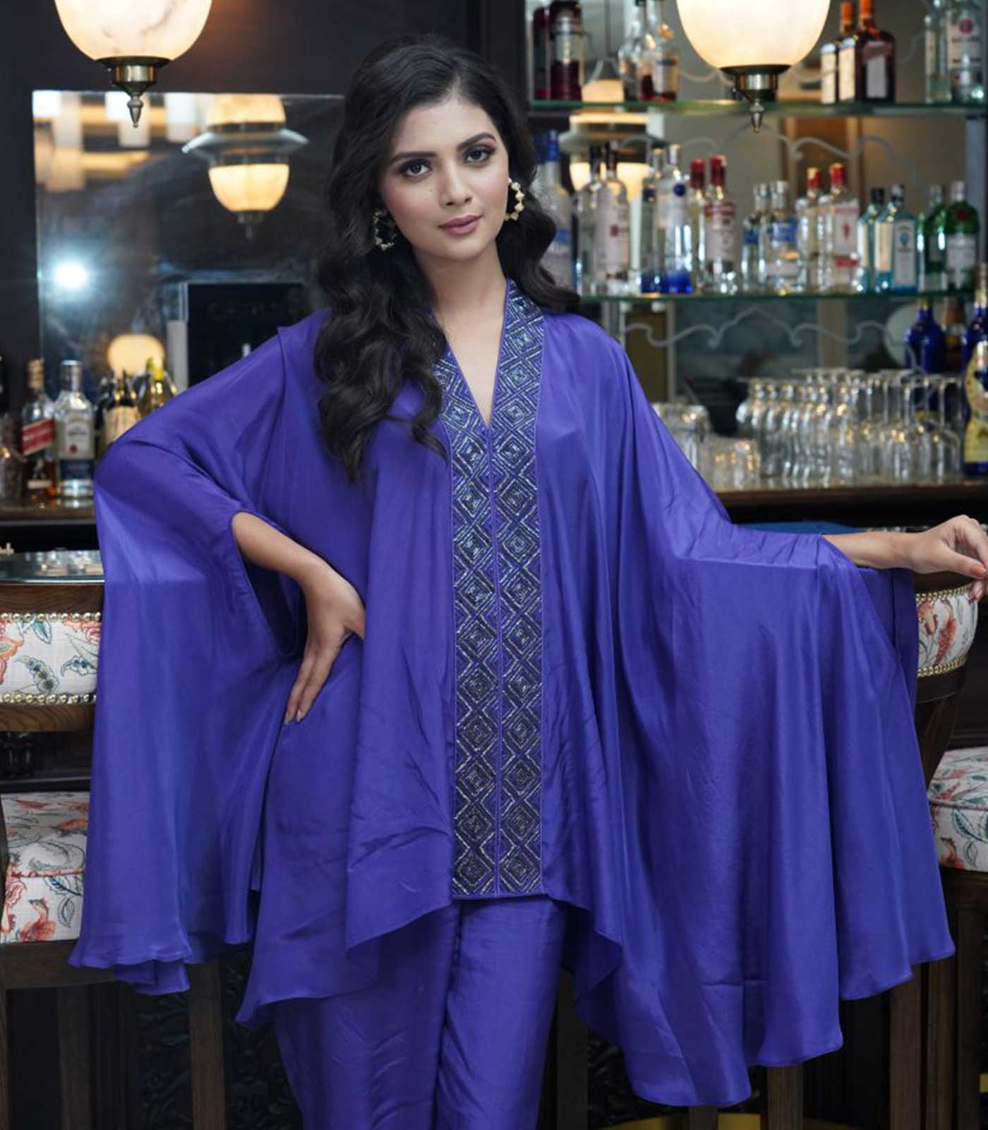 A smocked top paired with pants, embellished with detailed grey Nalki hand-embroidery, offers a full drama of smooth, flowy drapes.