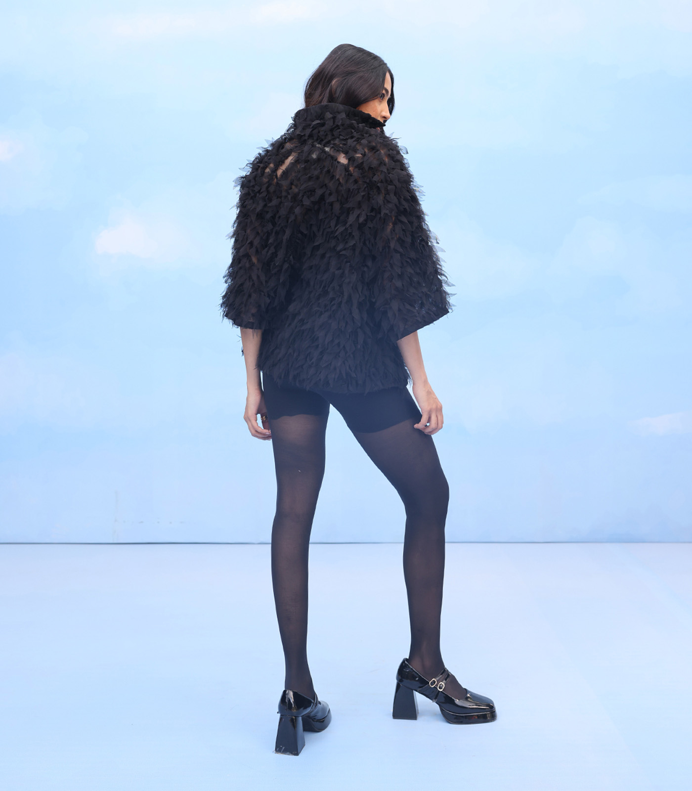 An oversized nylon net shirt, with pleated patchwork, featuring V-neck, wing collar and kimono sleeves for a graceful, fashion-forward silhouette.