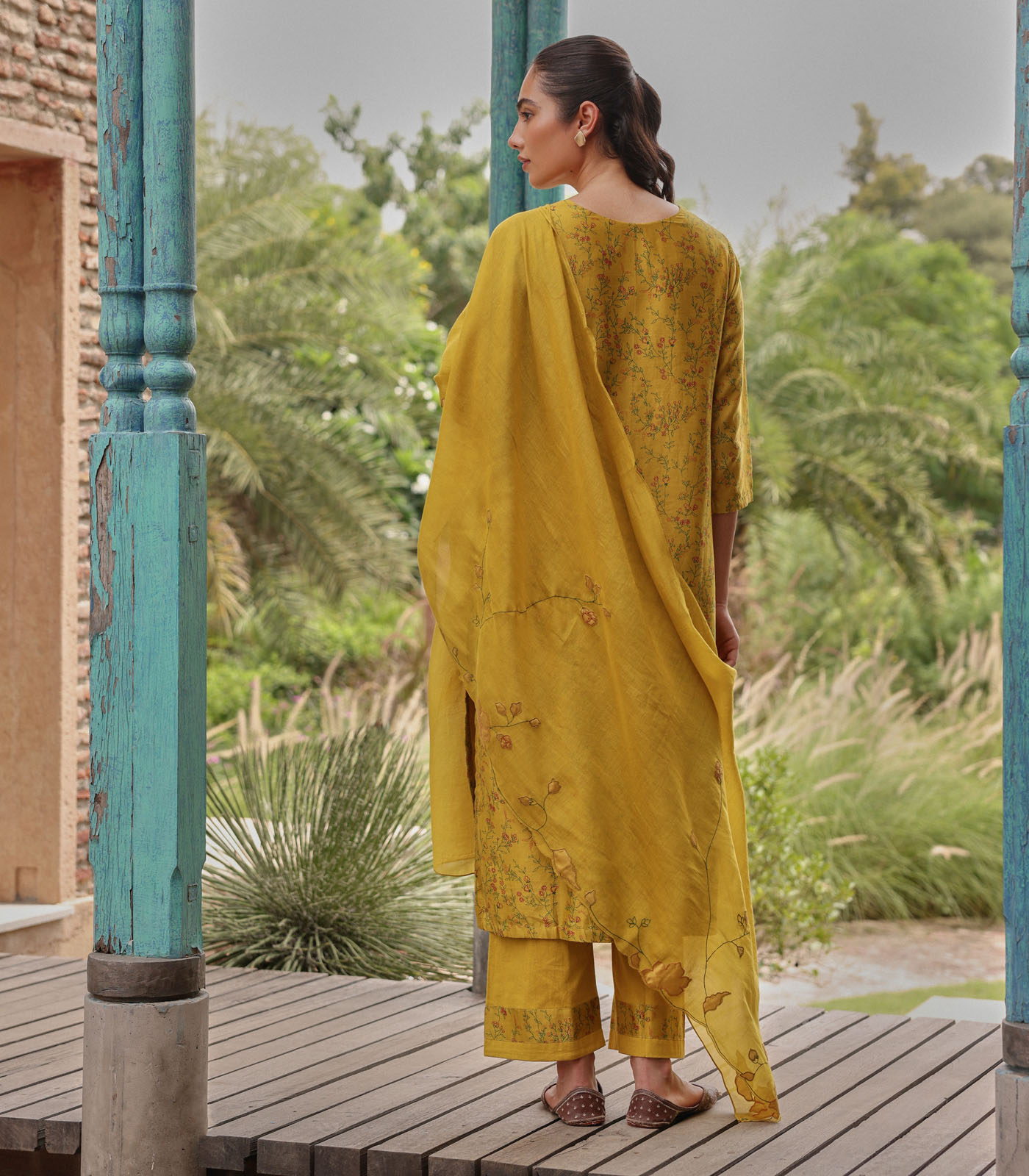 In the warm, sunlit tones the Tuscany Floral Kurta Set comes alive with delicate printed florals scattered across the kurta. It is paired with matching pants finished with printed cuffs and a dupatta adorned with delicate applique & thread work for a lively festive flair.