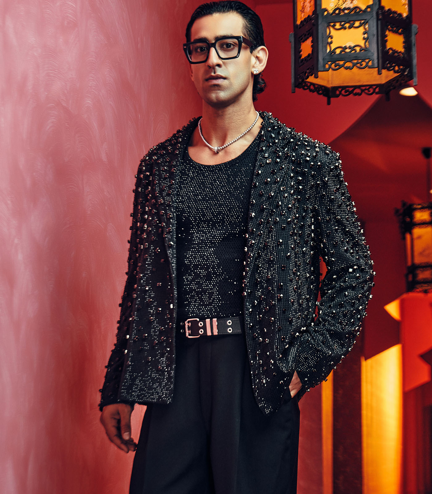This set includes a black blazer in melon crepe, a black ribbed tank top, and matching denim jeans in melon crepe.