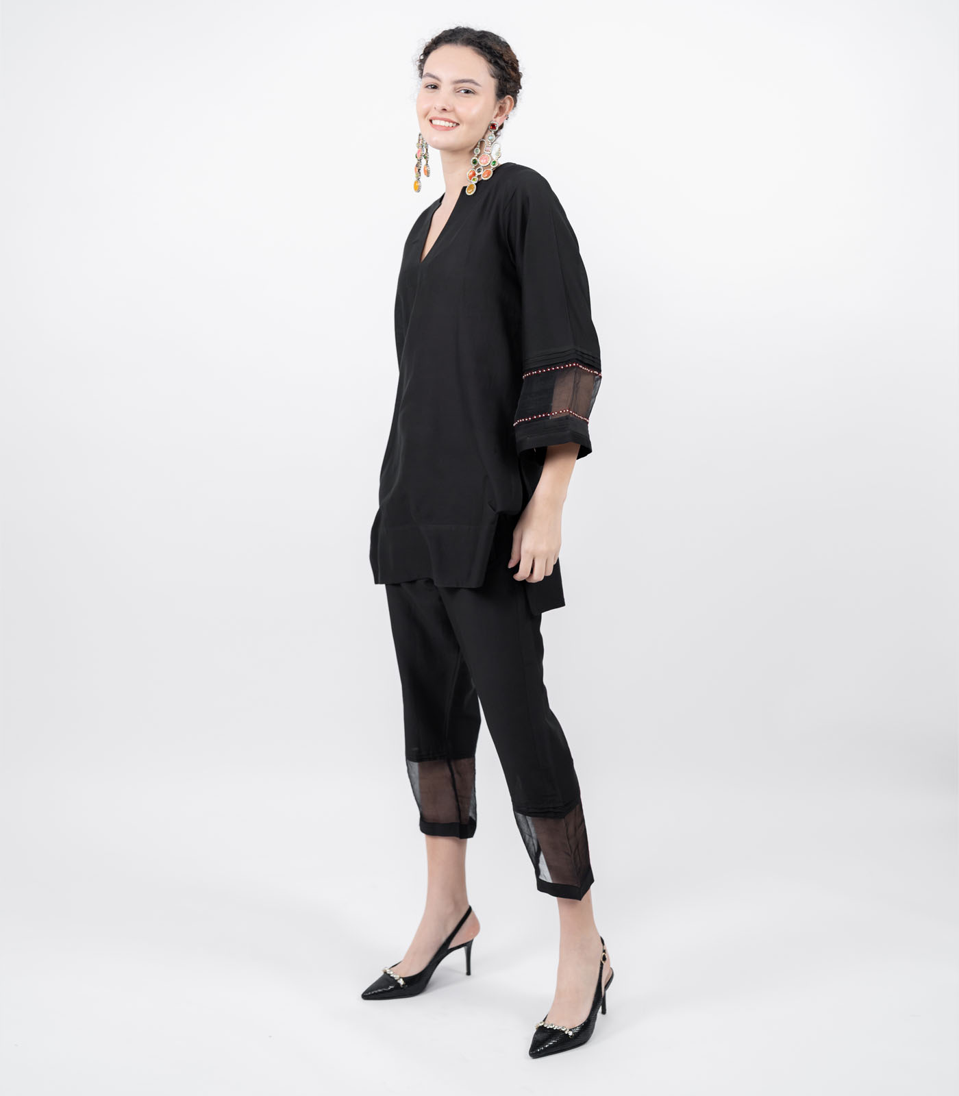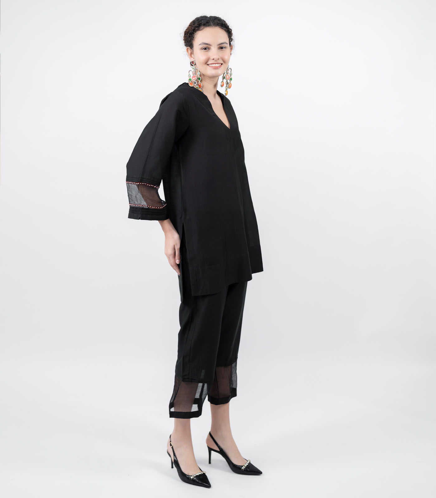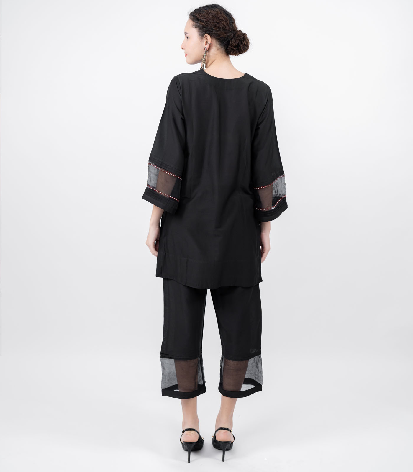 A traditional silhouette reimagined with contemporary artistry on lustrous cotton silk fabric, this co-ord set features a short asymmetrical top with dramatic sleeves sandwiched in organza silk and hand-embroidered with resham thread and pearls. Paired with ankle- length pants, the set balances structure with fluidity—minimal yet striking, modern yet timeless. It’s designed for the woman who moves through her day with grace, confidence, and ease.