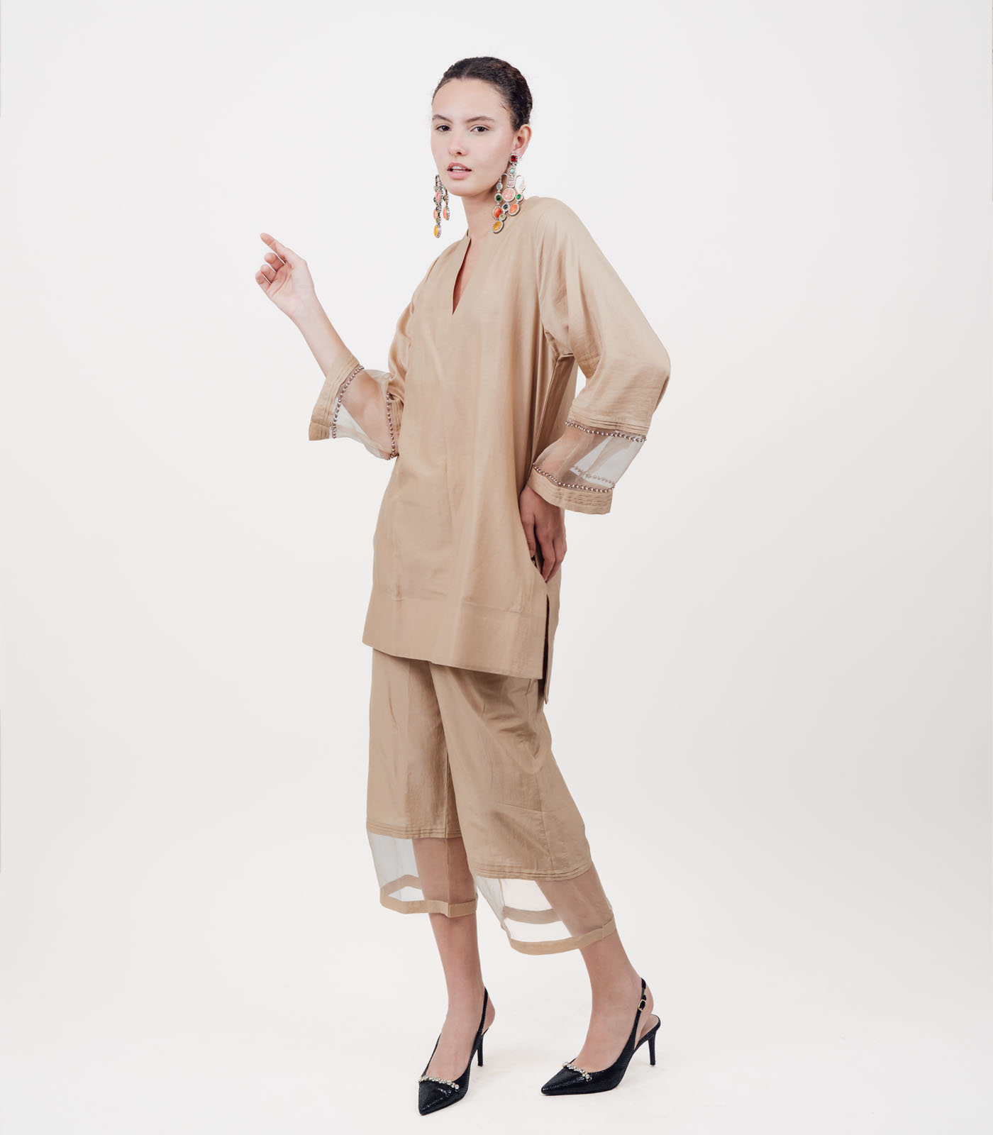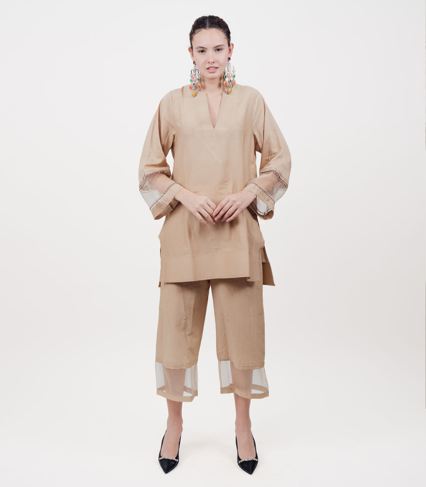 A traditional silhouette reimagined with contemporary artistry on lustrous cotton silk fabric, this co-ord set features a short asymmetrical top with dramatic sleeves sandwiched in organza silk and hand-embroidered with resham thread and pearls. Paired with ankle- length pants, the set balances structure with fluidity—minimal yet striking, modern yet timeless. It’s designed for the woman who moves through her day with grace, confidence, and ease.
