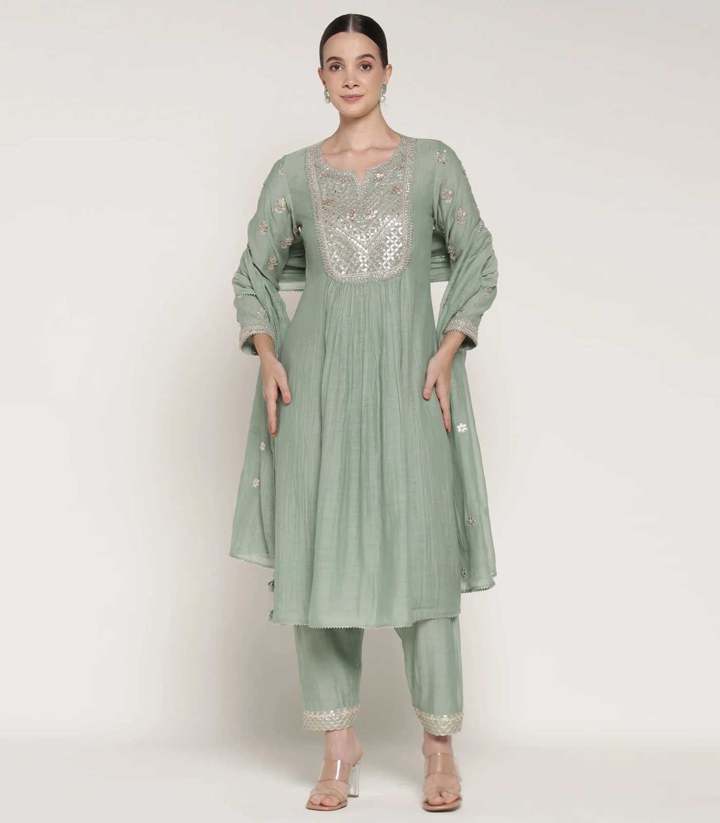 Winter Teal Yoke Kurta Set crafted in premium mul chanderi fabric and adorned with elegant gota work. This designer teal kurta set is perfect for festive occasions, family gatherings, and winter celebrations. A must-have embroidered chanderi kurta set for a chic and traditional look.