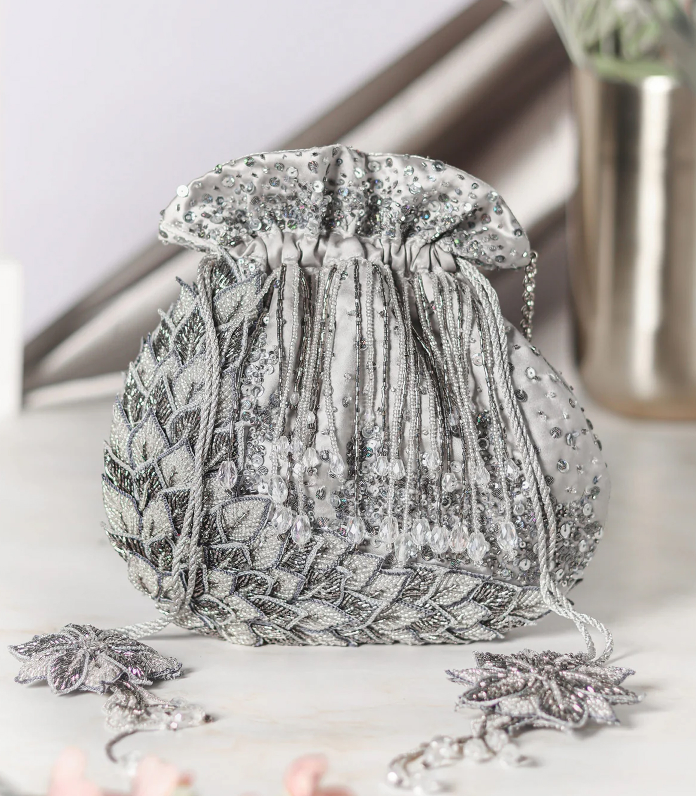 Intricate Applique Green Leaf Work in the Corners is what makes this Potli a dream come true! Designed with Sequins and Kathdana Bead Work, and tassels of beads and crystals that shimmy when you walk, or dance! This stunning Green Potli is all you need for your next Festive Event!