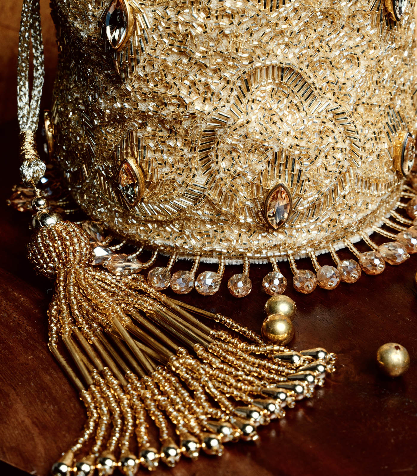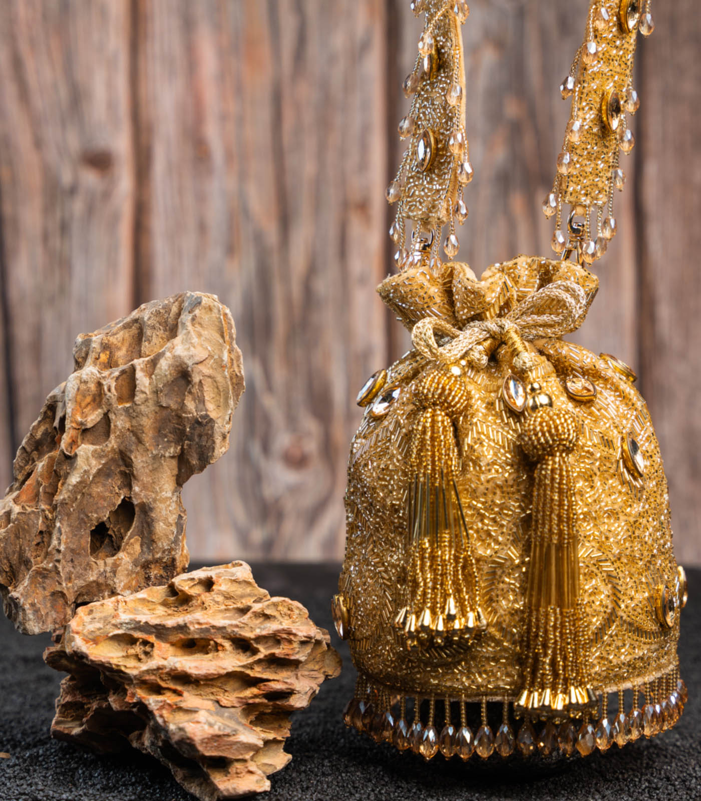 The Water Crystal Chic Orb – Gold potli is a radiant statement piece that embodies timeless luxury and exquisite craftsmanship. Handcrafted with intricate beadwork and sequin embroidery, it glimmers with a golden allure that catches every eye. The long, embellished handle features delicate crystal teardrops and shimmering stones, allowing it to be styled as a handfree potli for effortless comfort and elegance. Elegant golden tassels accentuate the drawstring closure, blending beauty with function. Perfect for weddings, festive occasions, or elegant evenings, this potli complements both traditional and contemporary attire with effortless grace. Pair it with ivory silks, metallic tones, or rich jewel hues to complete your look with a touch of regal sophistication.