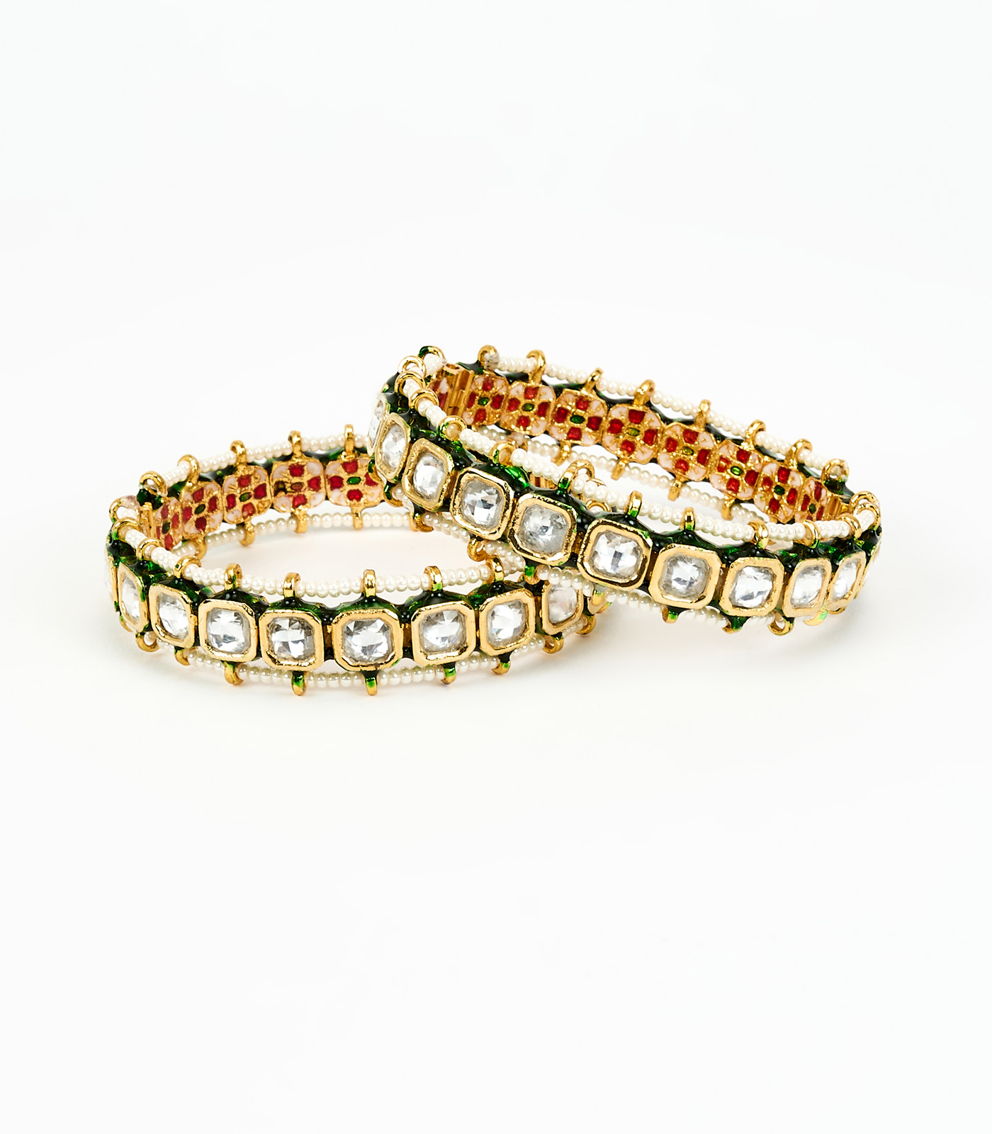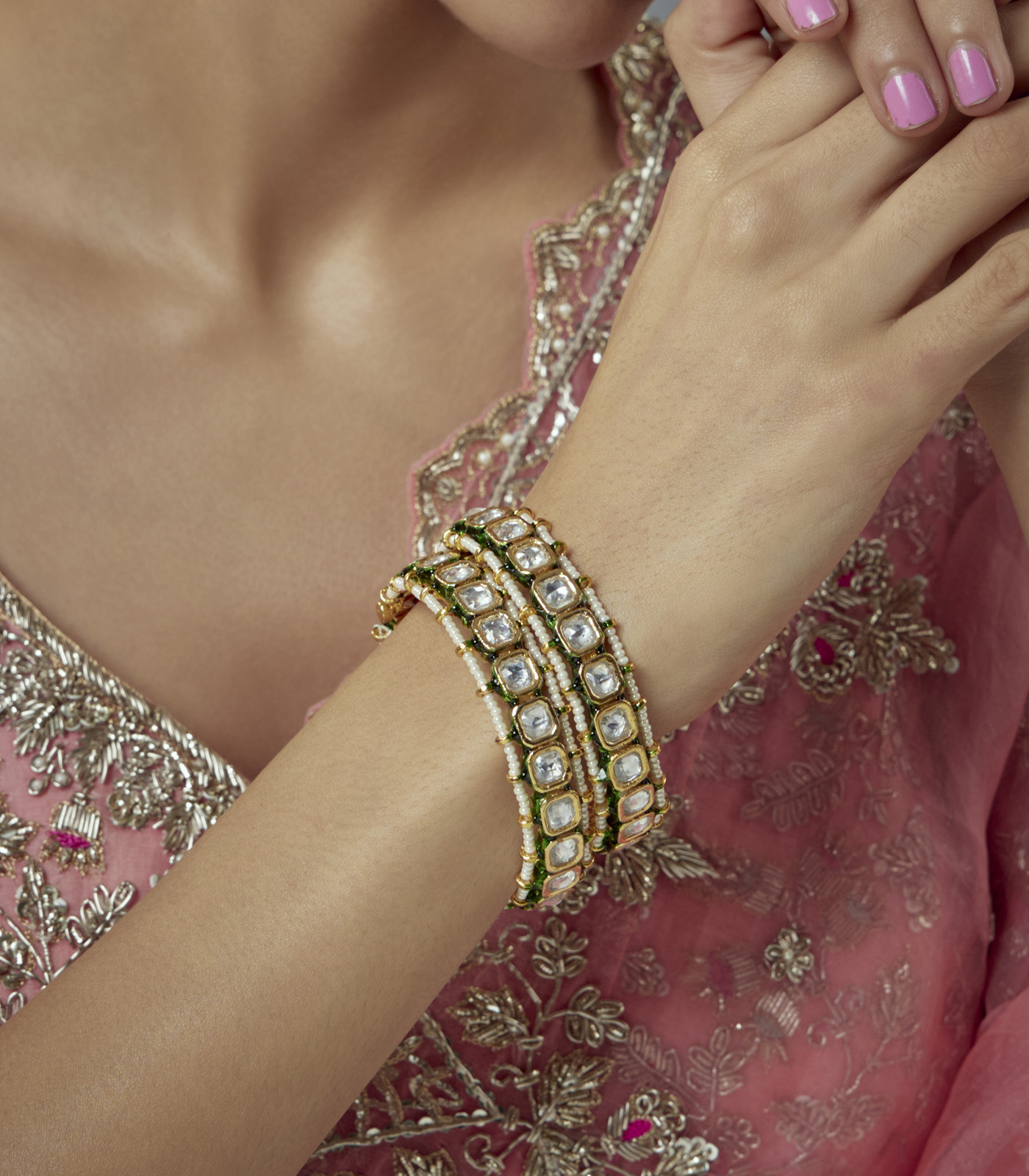 These regal bangles showcase intricate gold craftsmanship adorned with uncut stones & emerald accents. Perfect for weddings & festive occasions, they add timeless elegance to any traditional ensemble.