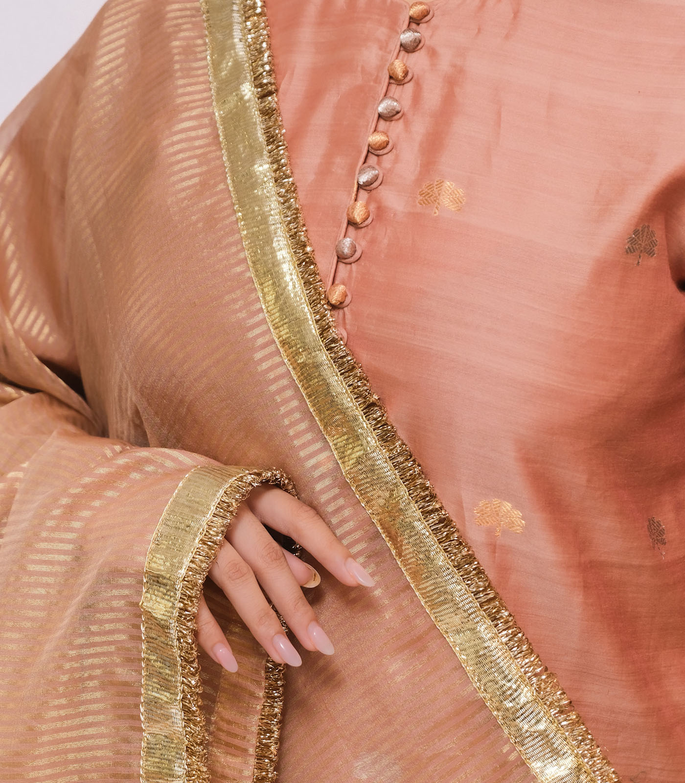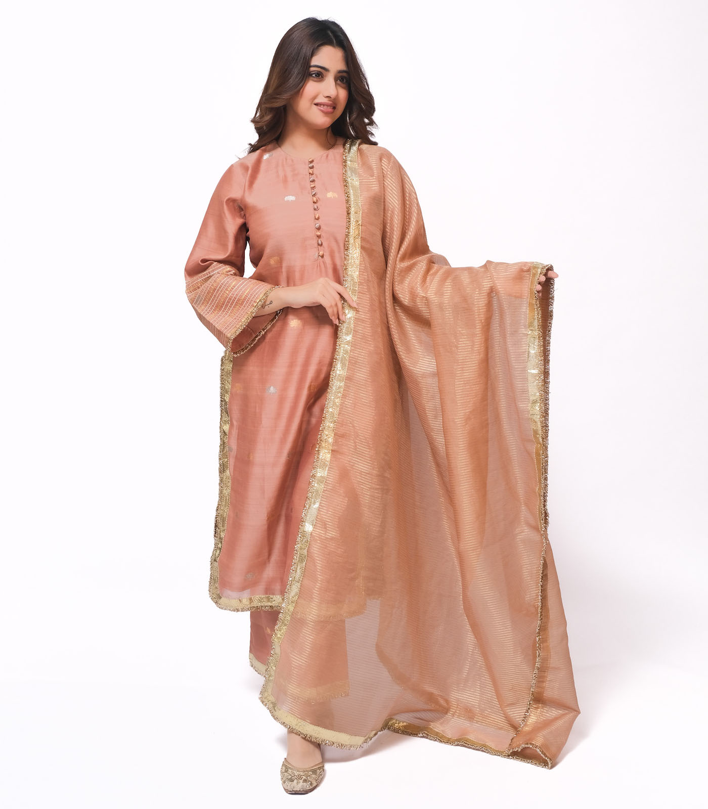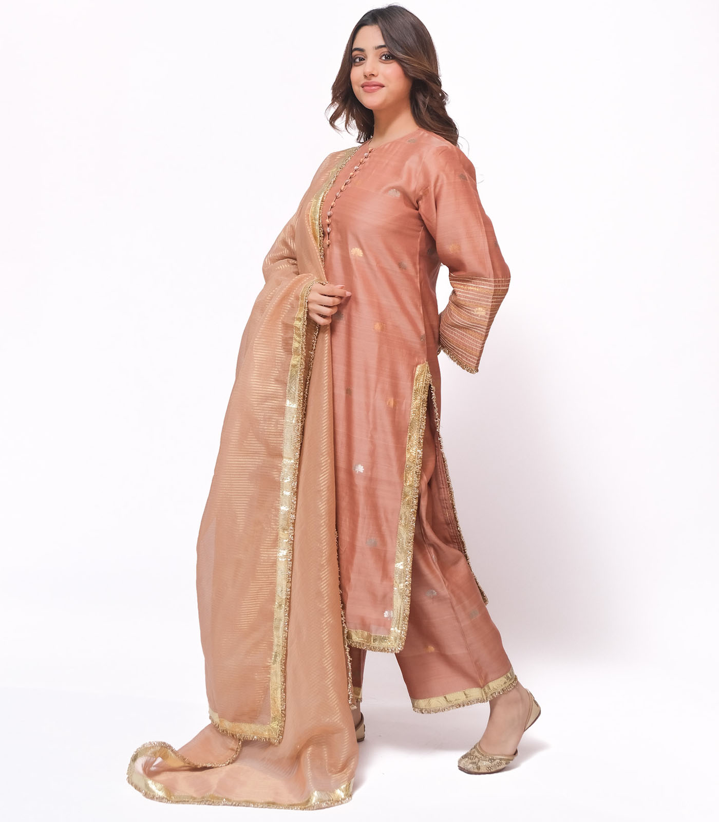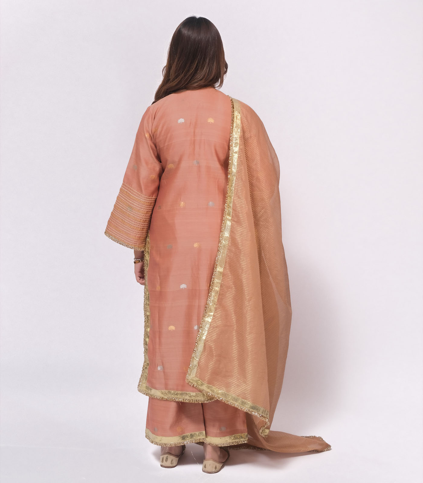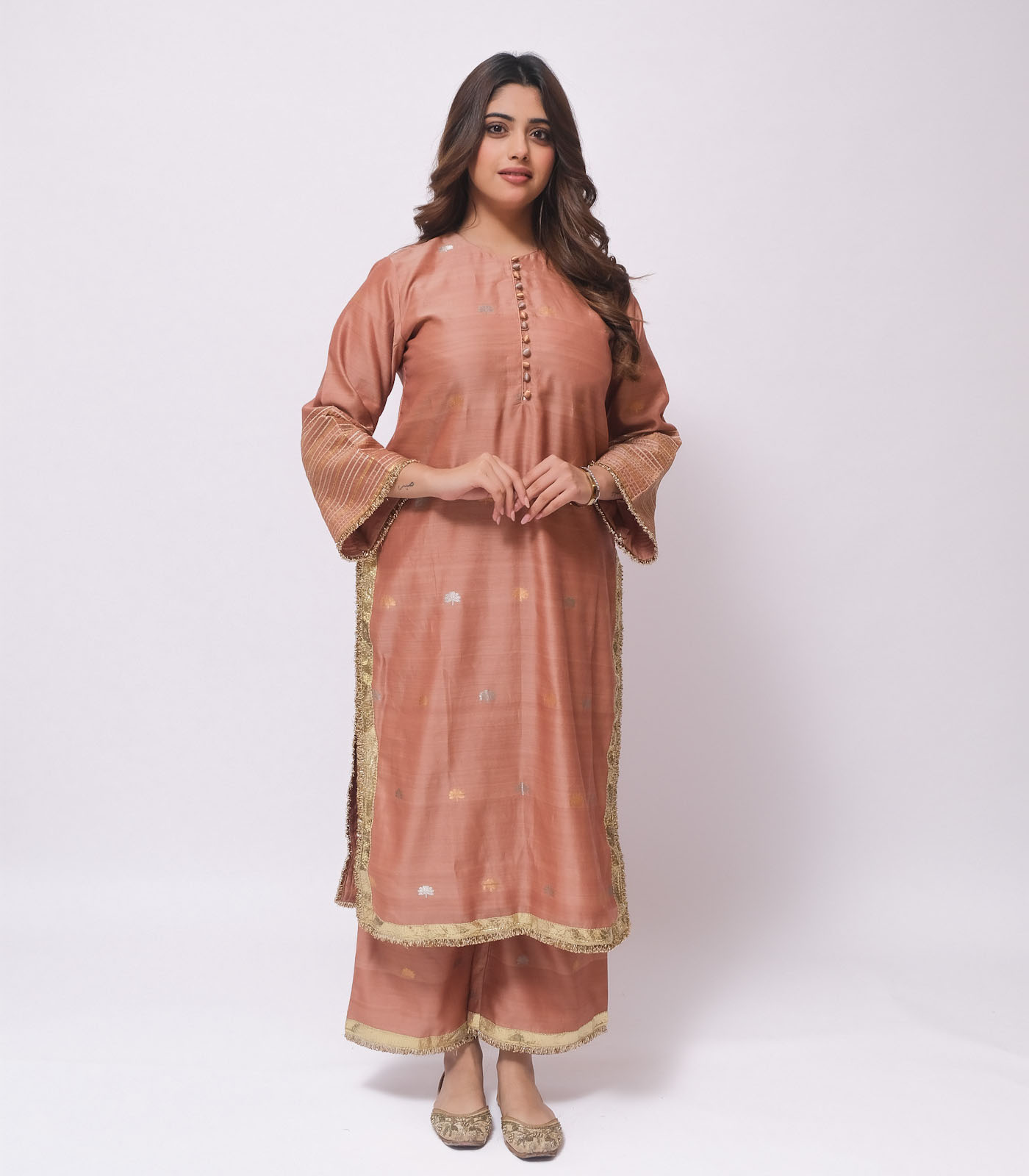 A celebration of light and movement, this set is crafted in pure Chanderi fabric, soft yet lustrous. The bell sleeves are adorned with subtle gota lines and finished with delicate gold trims Paired with loose- fit, ankle-length pants featuring understated lappa detailing, the ensemble flows effortlessly minimal yet festive, bold yet graceful. The look is completed with an elegant chanderi dupatta sandwiched in goldlappa and delicate trims.