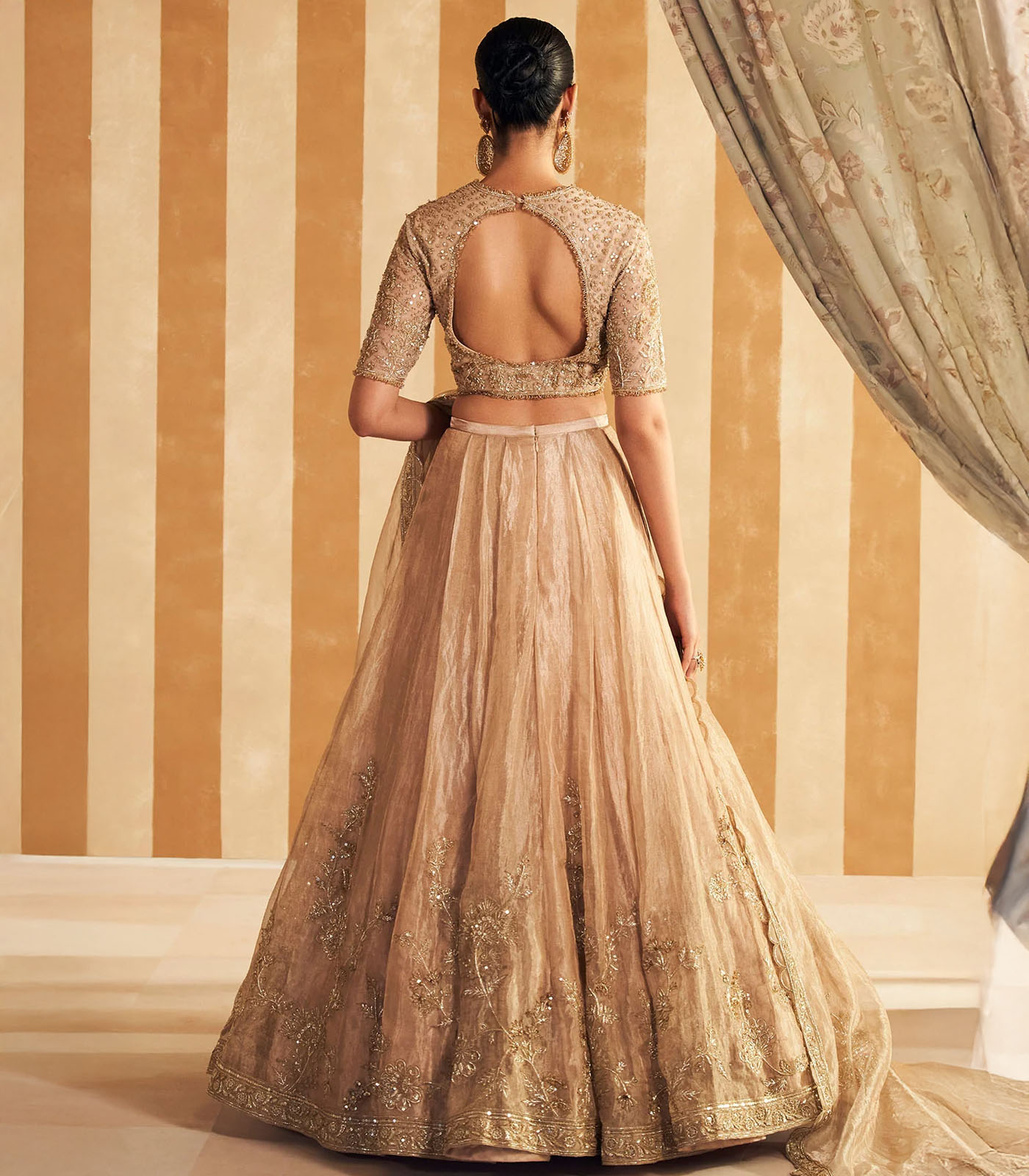 Hand Embroidered Gold Net Blouse paired with Gold Tissue Embroidered Lehenga and Embroidered Dupatta.on Gold Tissue