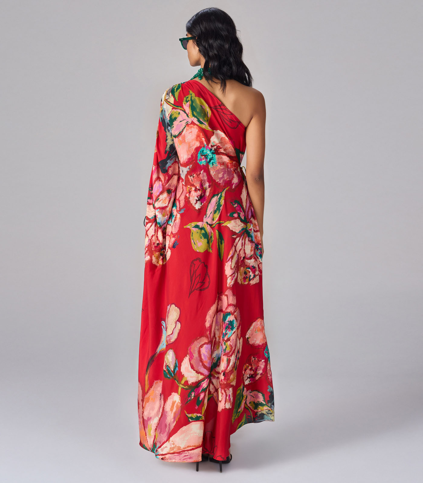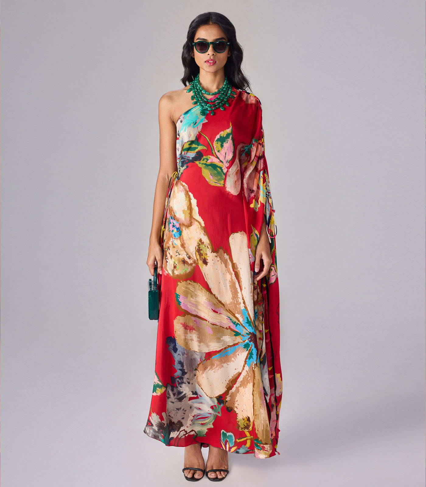 Floral print assymetric, one shoulder kaftan with side tie and hand embroidered tassle tie ups