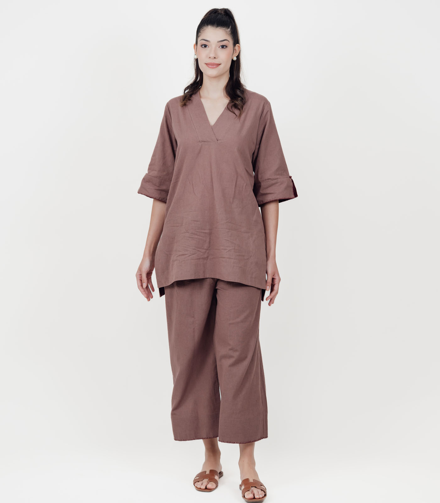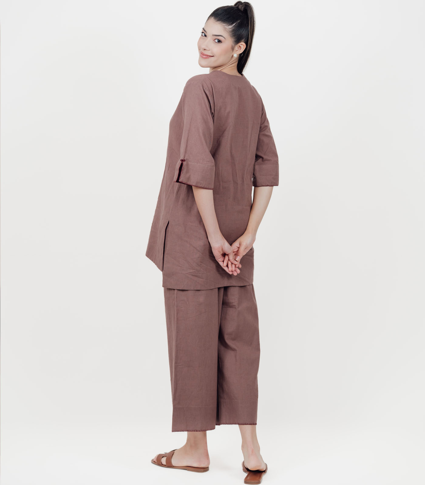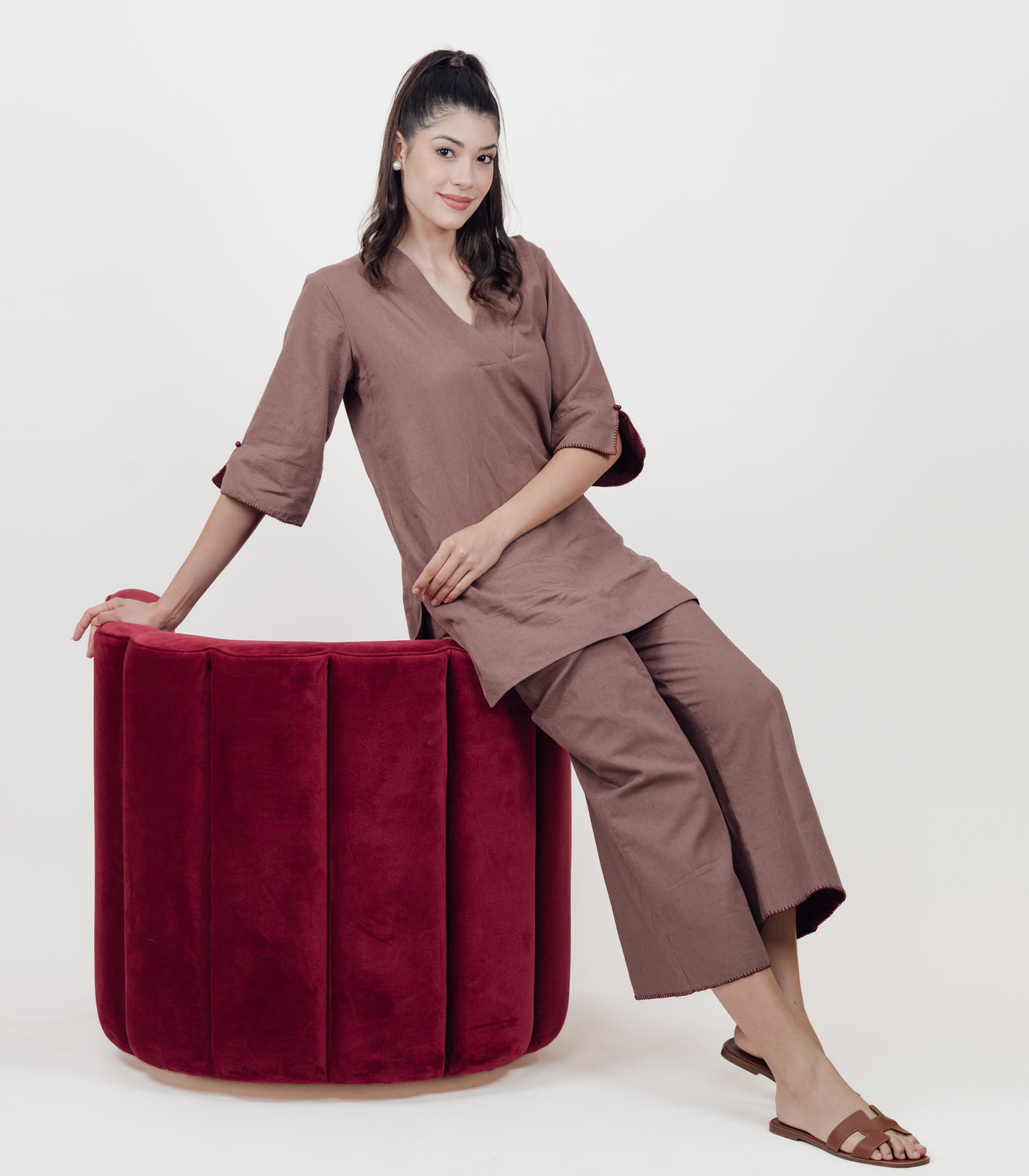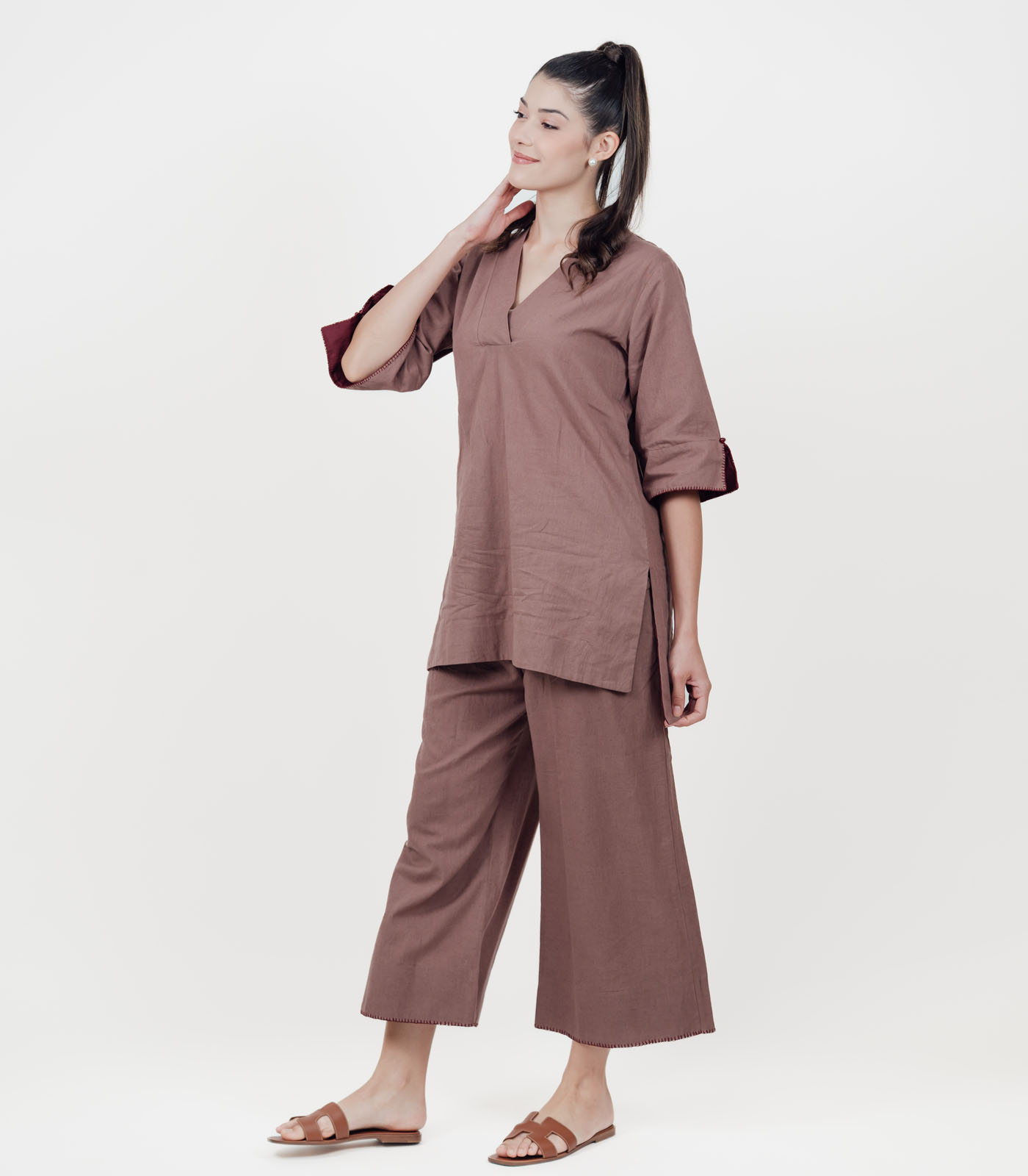 Made with premium cotton linen, this Co-Ord Set features an asymmetrical relaxed fit top with hand embroidered statement sleeves. Paired with loose fit ankle length bottoms, making it versatile for both casual and semi formal wear. The hemline is detailed with subtle stitch accents for a refined touch. The relaxed silhouette gives it a modern yet timeless appeal. Over-all this Co-Ord Set is a minimal, breathable and functional ensemble that transitions seamlessly from work to leisure.