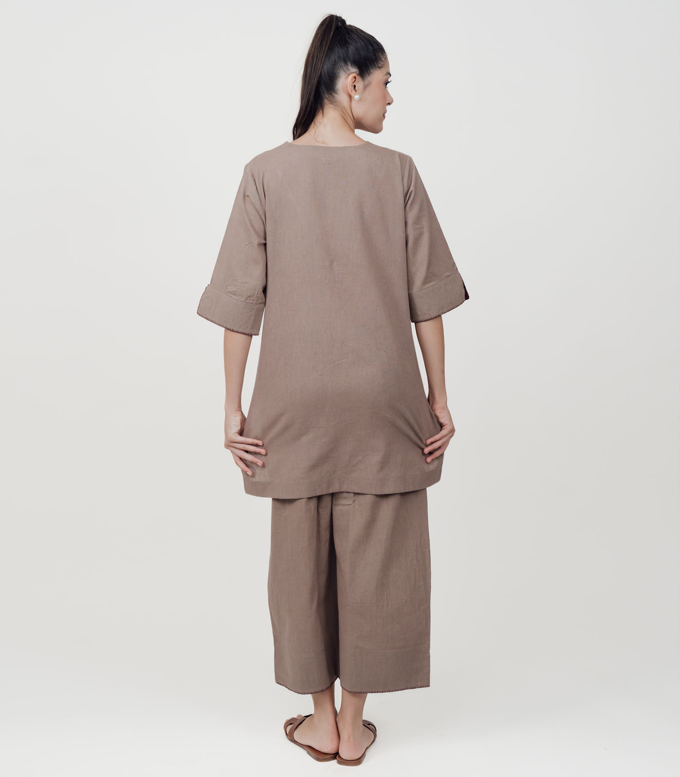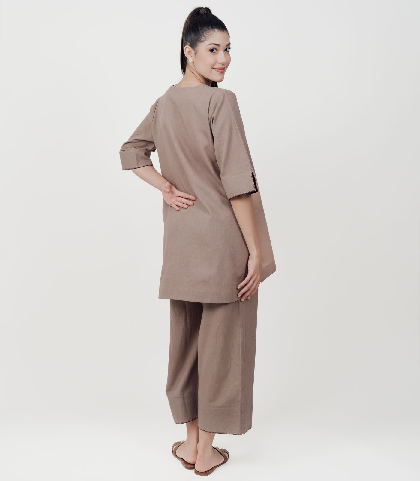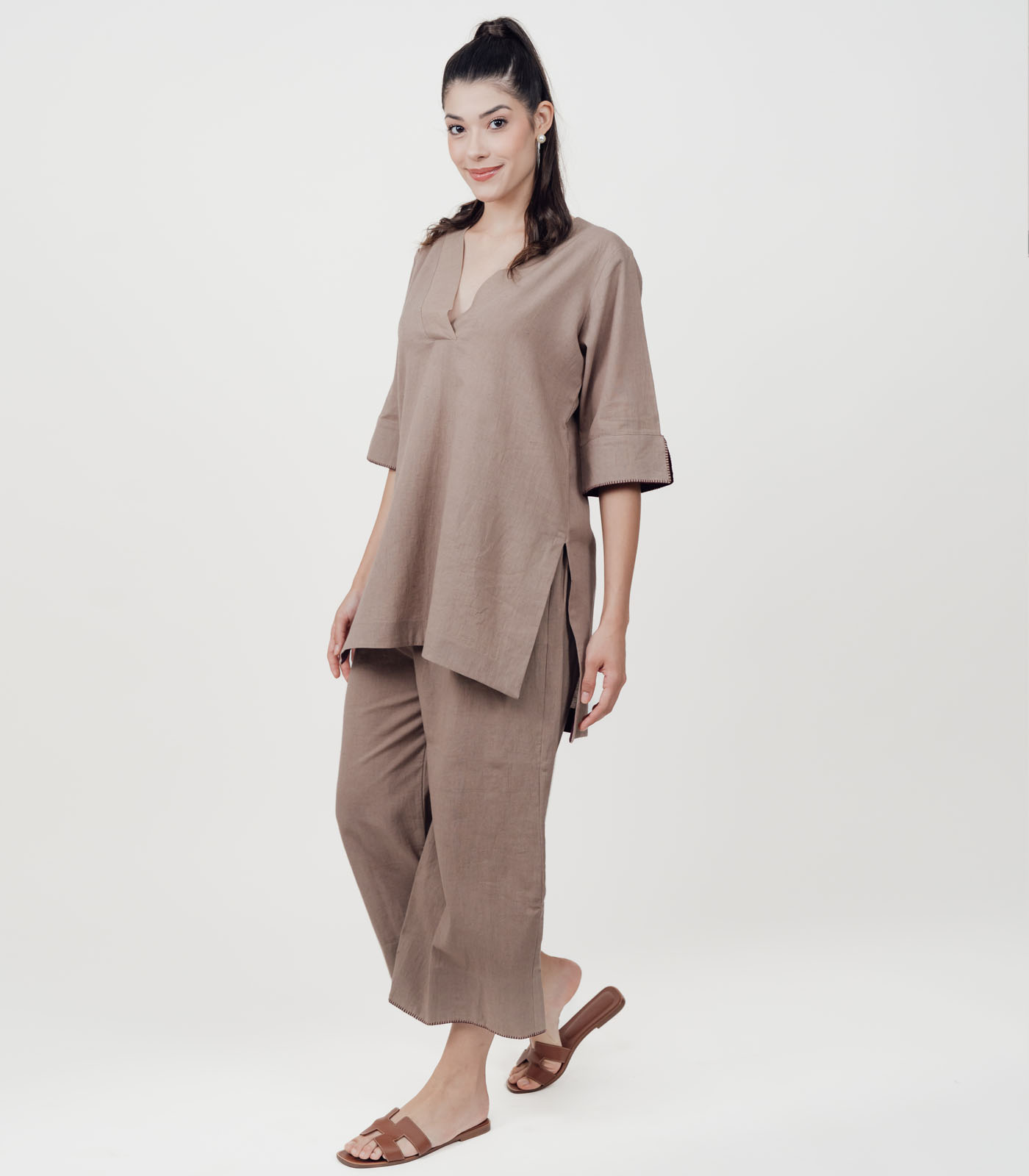 Made with premium cotton linen, this Co-Ord Set features an asymmetrical relaxed fit top with hand embroidered statement sleeves. Paired with loose fit ankle length bottoms, making it versatile for both casual and semi formal wear. The hemline is detailed with subtle stitch accents for a refined touch. The relaxed silhouette gives it a modern yet timeless appeal. Over-all this Co-Ord Set is a minimal, breathable and functional ensemble that transitions seamlessly from work to leisure.
