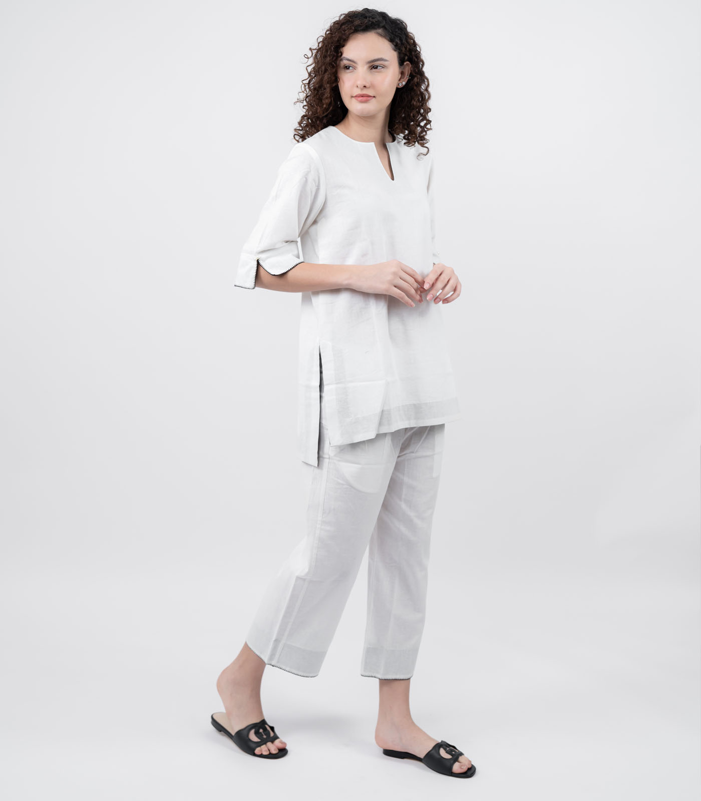 Made with premium cotton linen, this Co-Ord Set features an asymmetrical relaxed fit top with hand embroidered statement sleeves. Paired with loose fit ankle length bottoms, making it versatile for both casual and semi formal wear. The hemline is detailed with subtle stitch accents for a refined touch. The relaxed silhouette gives it a modern yet timeless appeal. Over-all this Co-Ord Set is a minimal, breathable and functional ensemble that transitions seamlessly from work to leisure.